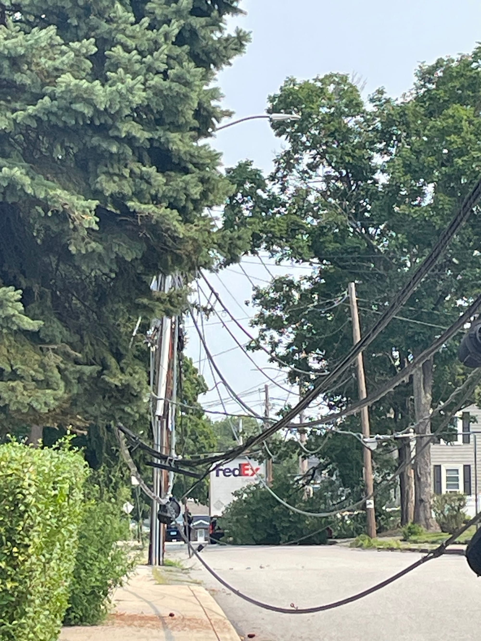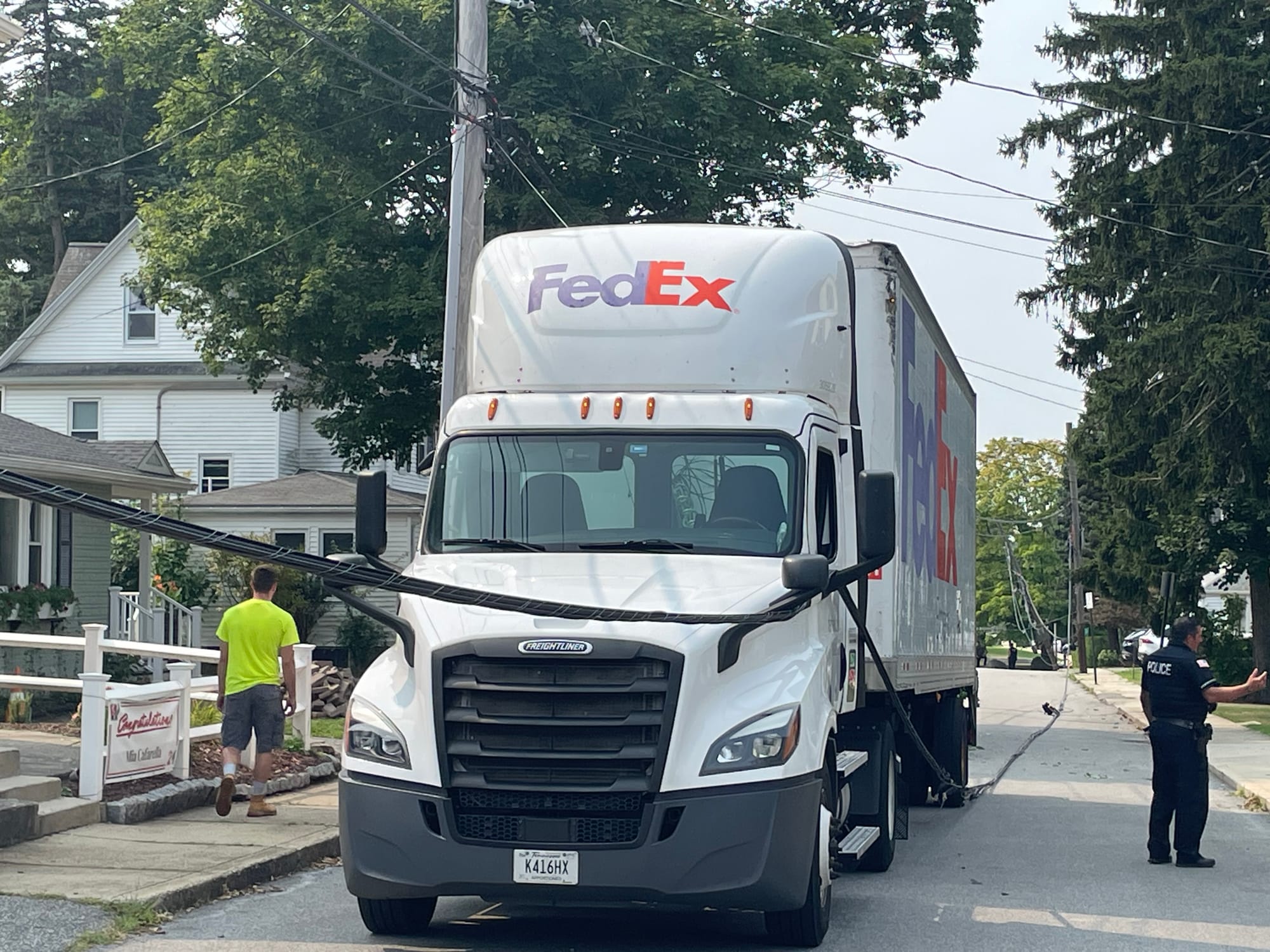Winchester Police keep residents away from the Federal Express truck that caused the accident on Spruce Street. Utility and power lines can be seen on the truck. WINCHESTER NEWS STAFF PHOTO/SHUKONG OUThe struck utility pole tilted to an angle, but did not fall. WINCHESTER NEWS STAFF PHOTO/SHUKONG OUFallen utility and power lines as well as a tree can be seen after a Federal Express truck hit a pole and the tree. WINCHESTER NEWS STAFF PHOTO/SHUKONG OUEversource arrives on the scene of the Aug. 15 accident with a new utility pole. WINCHESTER NEWS STAFF PHOTO/SHUKONG OU