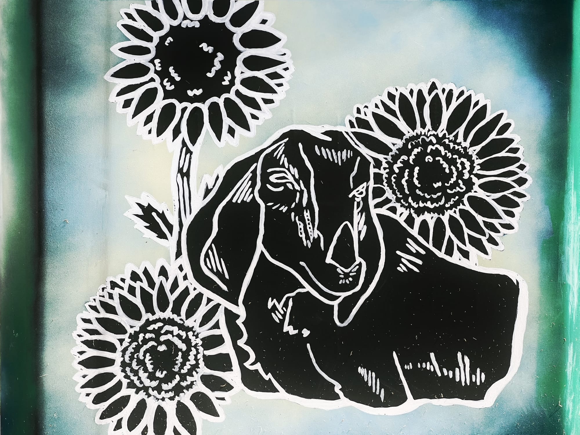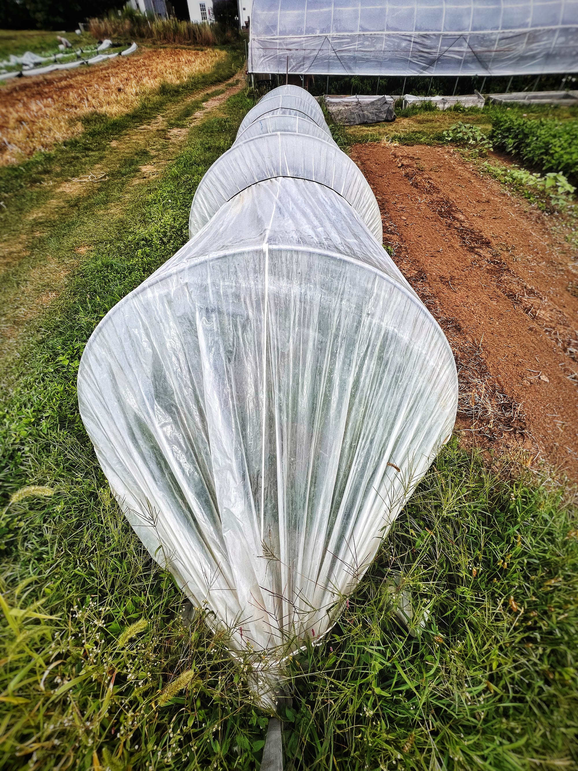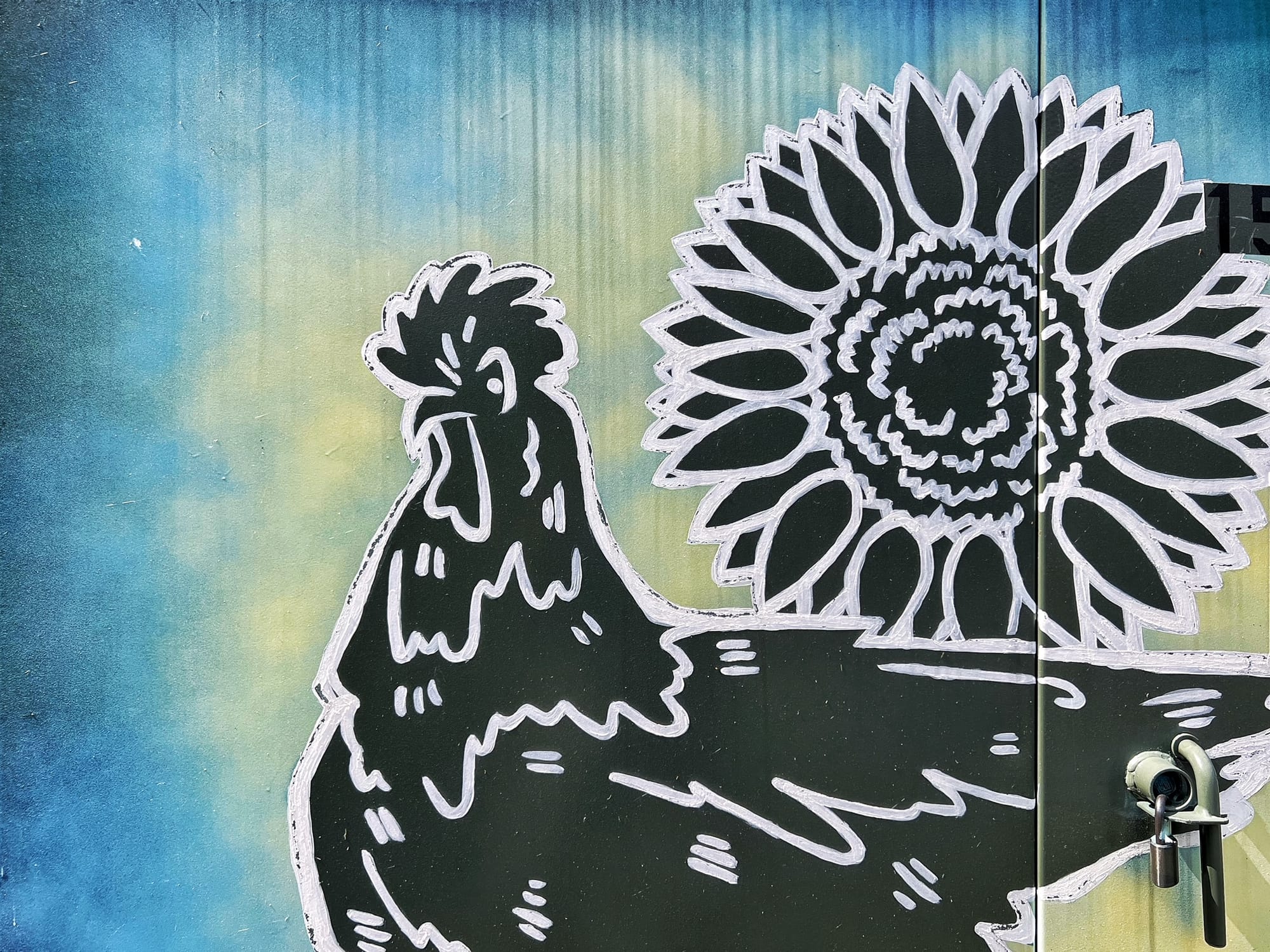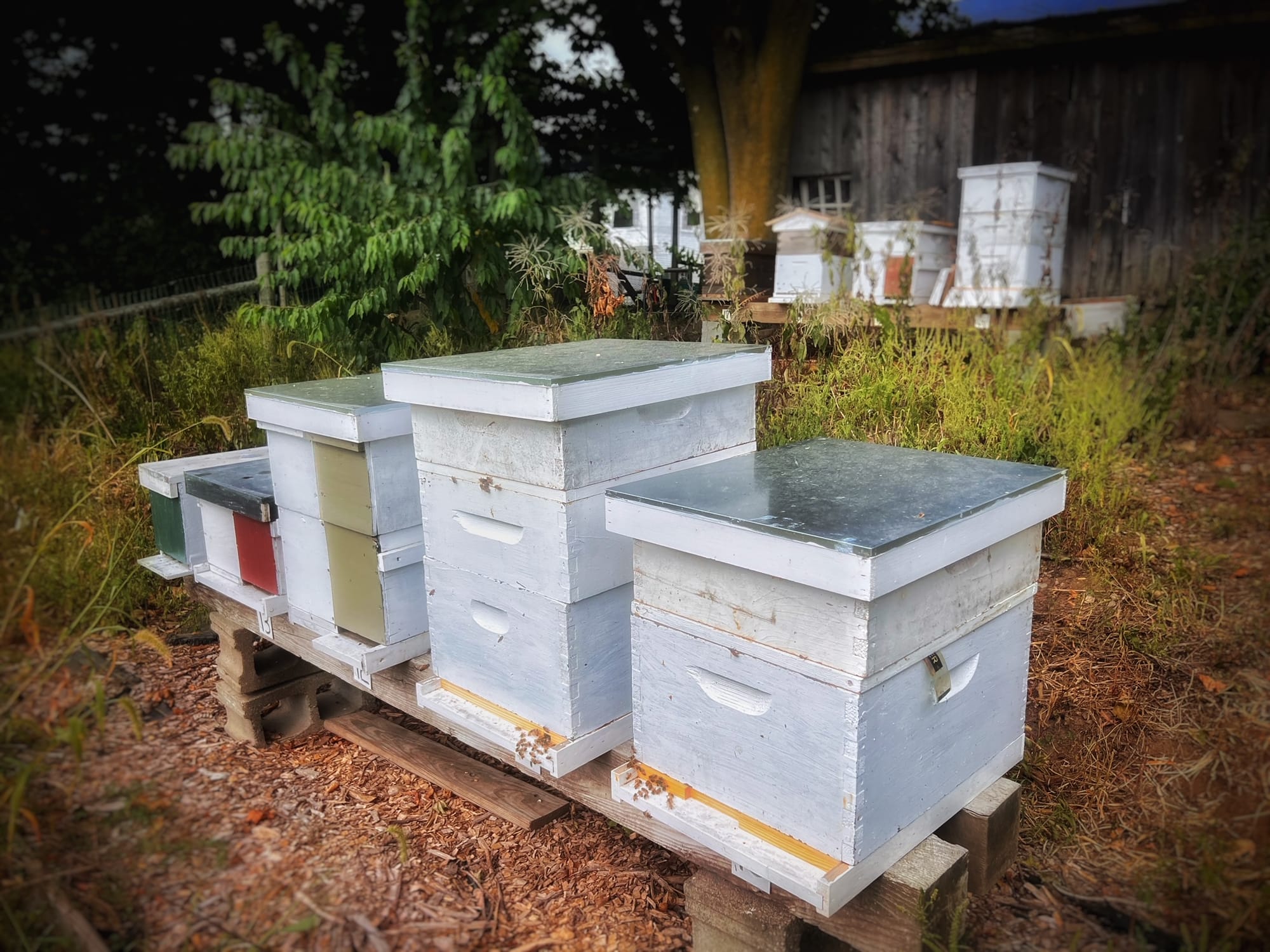 Top row, left to right: beehives, row cover over vegetable crops; bottom row: painted utility box/PHOTOS BY FRANK SITEMAN.