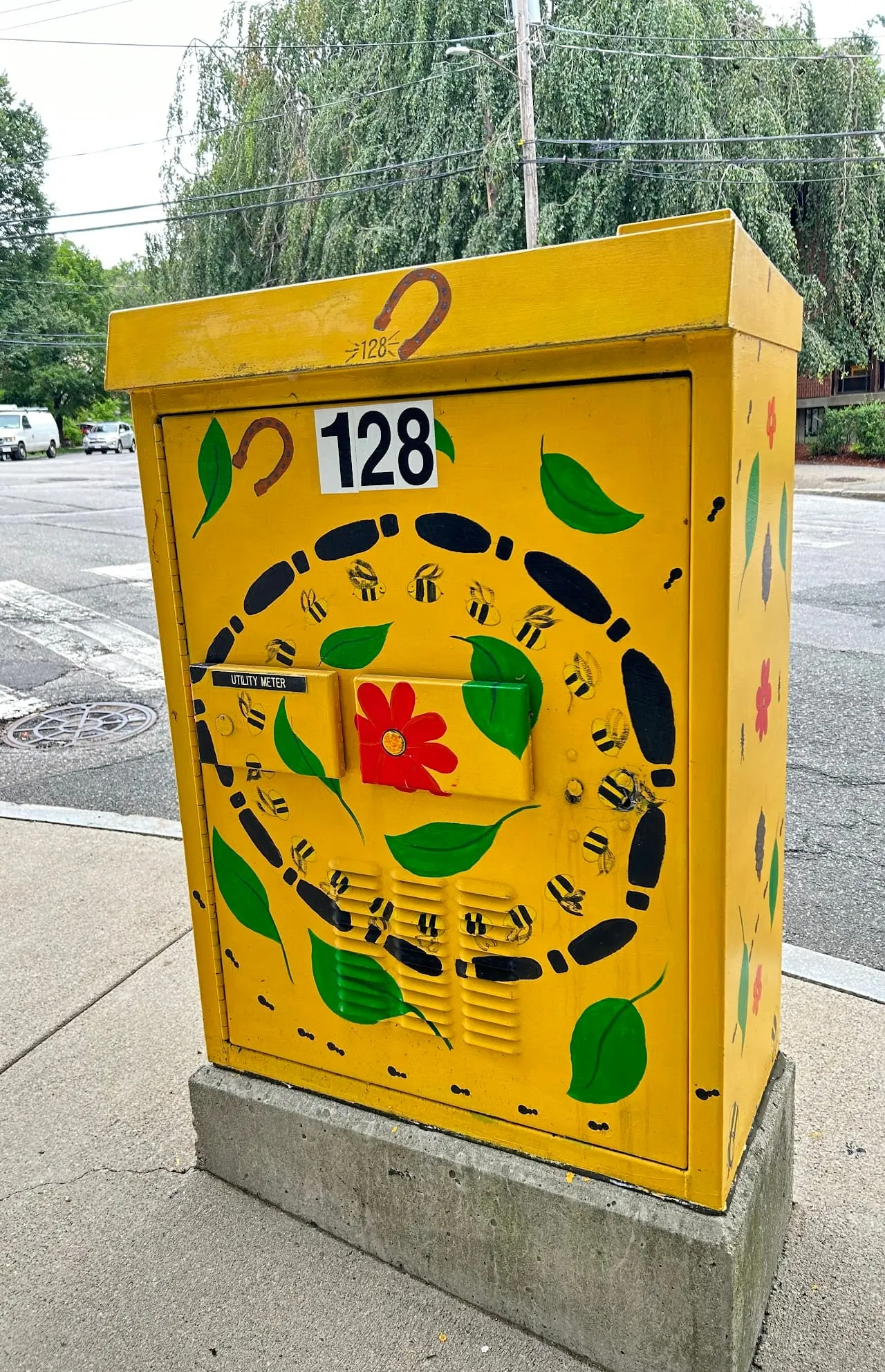 July 4, 2023. Thanks to a grant from the Winchester Cultural Council, seven local artists are starting to paint some of the downtown utility boxes, the refrigerator-sized metal containers that hold traffic light controls and cable and electrical connections. Arlington and Lexington folks have been painting their boxes for years, and the cultural council got permission from the town and utilities to sponsor them in Winchester. Hilda Wong-Doo, one of the jurors, says, “I’m so excited to highlight the talent of Winchester artists and begin investing in permanent outdoor art in the Cultural District.”