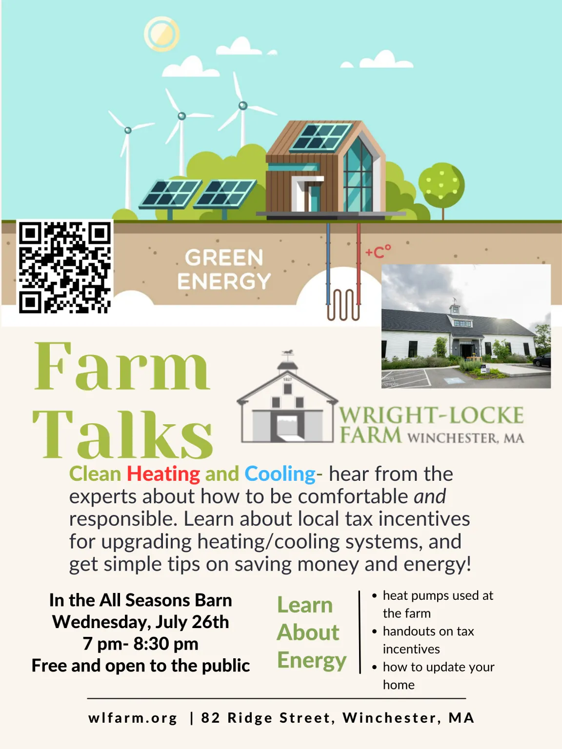 This Thursday, Wright-Locke Farm's weekly farm talk will be about how to be "comfortable and responsible" and how to get tax incentives for upgrading your heating and air-conditioning systems. The talk is from 7 to 8:30 P.M. in the farm's All Seasons Barn.