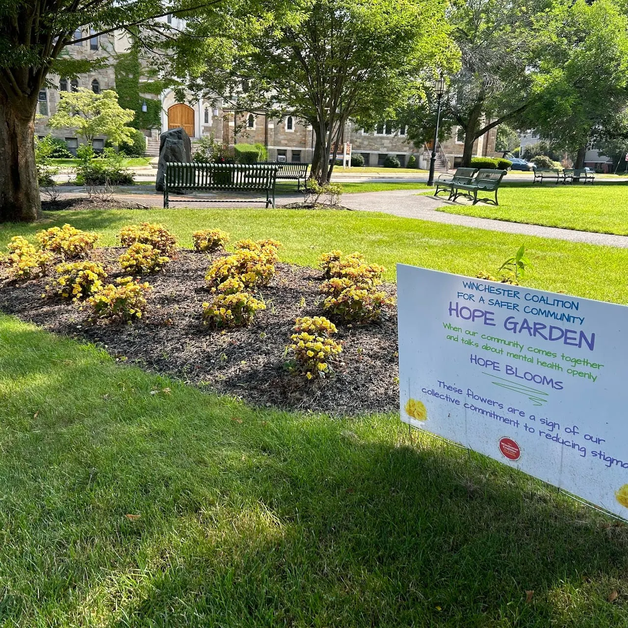 The little park across from the Winchester Public Library was enhanced by the addition of bright yellow begonia plants in what the Winchester Coalition for a Safer Community calls a “Hope Garden.” The organization, begun in 1998, has the mission “to reduce substance abuse, particularly in the youth community, and to foster healthy life choices through education,” and is housed within the town’s Health Department. As a major Cummings Grant recipient (shared with 32 other non-profits), the Coalition lists sources of support for Winchester residents. And according to Dot Butler, the coalition’s program manager, it provides programs to high school students and their parents. It also runs training for police officers and firefighters, as well as librarians and teachers to understand how to deal with mental health issues among the general population whom they may encounter.