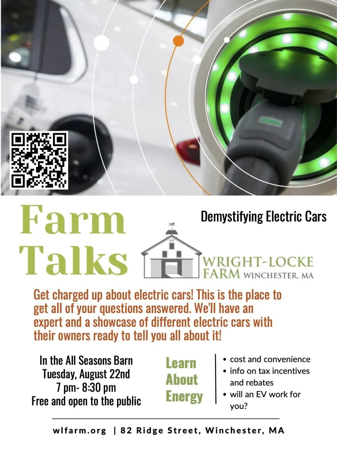 Come check out some EVs at 6:30 in the All Seasons Barn parking lot!. Parking will be limited so please plan on parking at Mullen Field (54 Ridge St.) and walking from there.