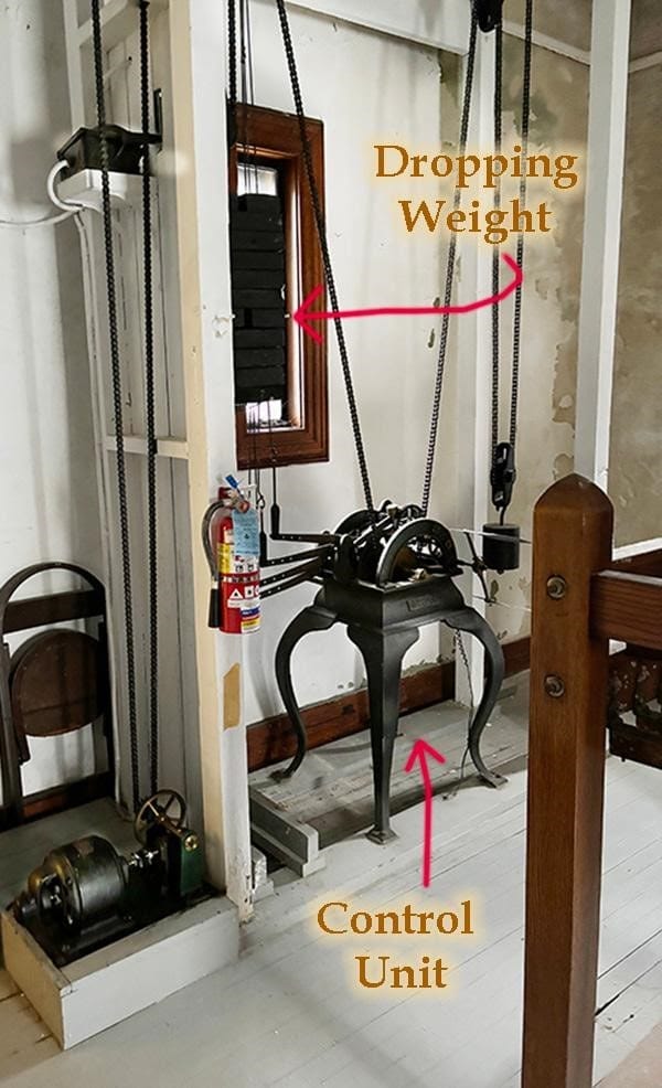 Amazingly, all of the bells, chimes, and controller was installed in the 1920s and still work today (except for that clock paper tape gizmo). The damaged coupling was replaced with a metal and plastic spider coupling, which cost about $20. It took under an hour to replace. We included these images of the bells and control armature to round out a glimpse at the uppermost level of the bell tower.