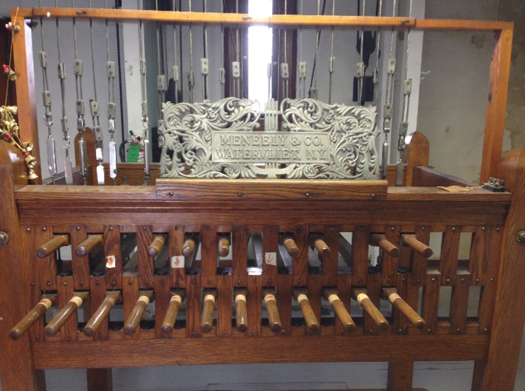 I returned to the bell tower and found this set of handles which is used to play the chimes and has the vendor name MeNeely & Company, Watervliet, NY (near Rochester). The company opened in 1826 and closed in 1952 (before I was born).