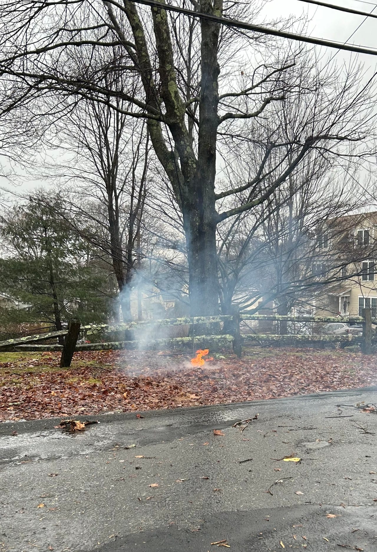Photos above from left to right, or top to bottom: Highland Ave at Everell, photo by Leigh Shipp; River St. by Kathleen Ruminski; Dunster Lane power line igniting leaves by Joyce Westner