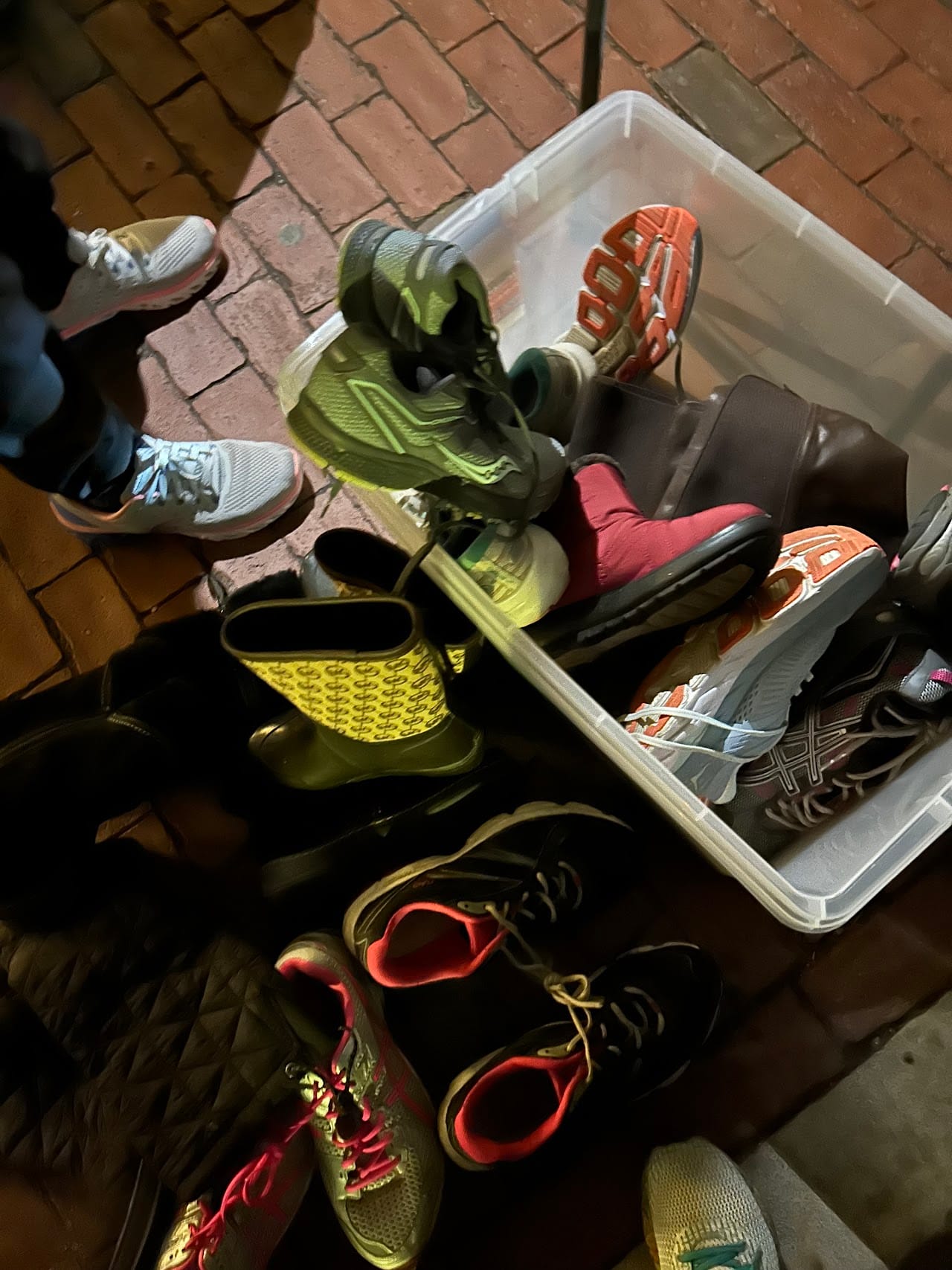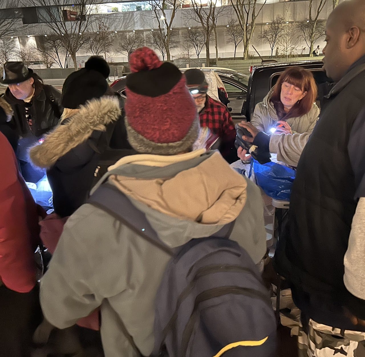 At 7:30, the food is put away and the clothing comes out. Their clients eagerly look through the bins and bags, with help from the volunteers who wear headlamps to help find the right sizes. Some weeks the group also gives out hotel-sized toiletries, new underwear adult diapers, and gift cards for Dunkin Donuts and McDonald’s. “The gift cards mean the homeless folks can not only buy a hot meal, but stay inside the restaurant and use the restrooms,” Monteiro said.