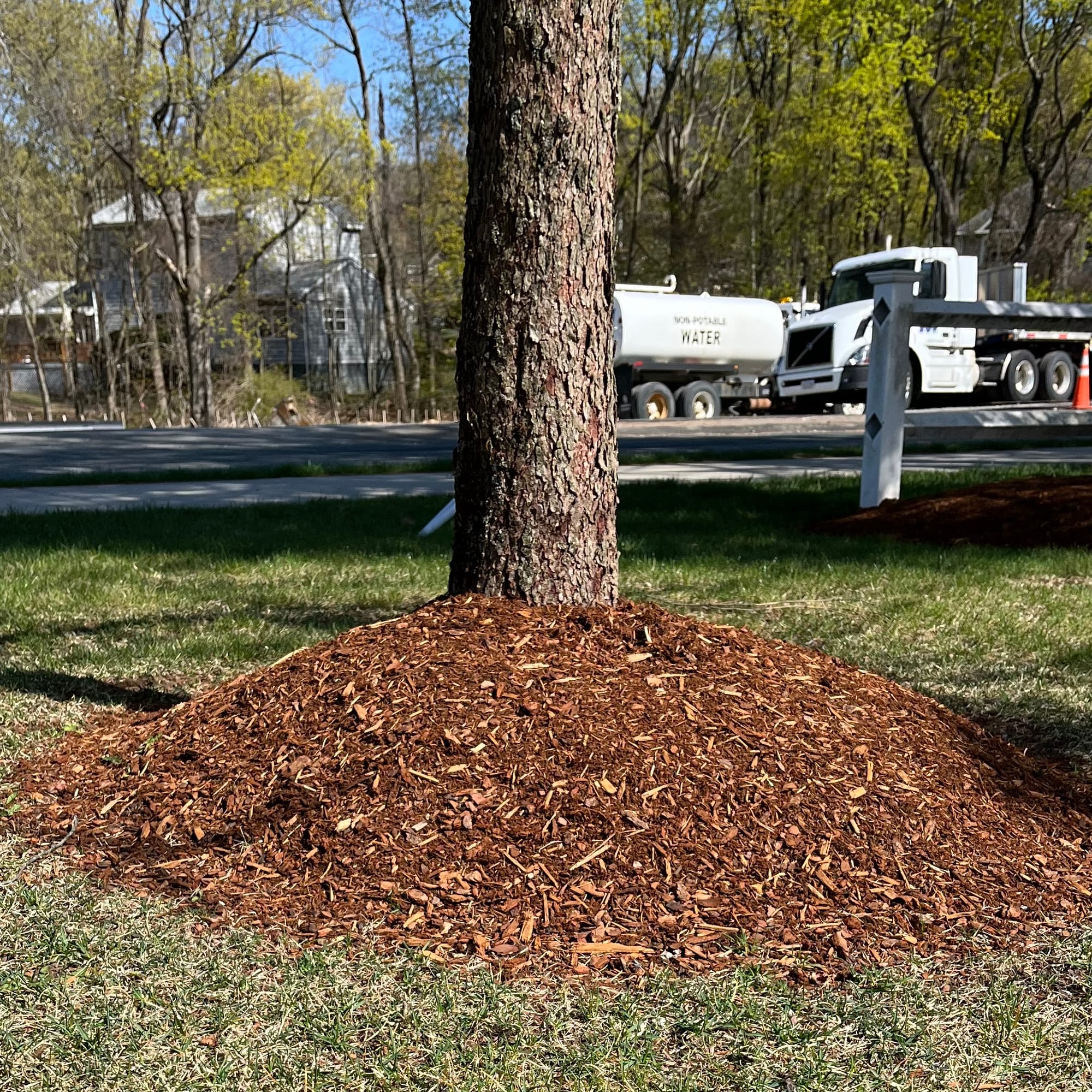 The most important principle is that mulch should never be used to raise the grade around plants. Burying plant root crowns and flares under layers of mulch will suffocate and kill them. With larger plants and trees, we want to avoid the “Mulch Volcano,” where giant mounds are built up around the base over years. It won’t kill them immediately, but it will eventually, as they are suffocated and girdling roots form to strangle the trees.