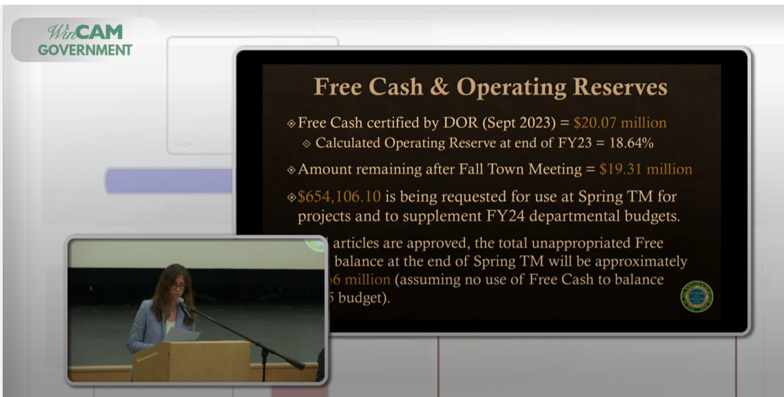 Miller, who offered the Finance Committee’s report, also spoke to the budget. He called the budget “structurally balanced” and said there was no use of free cash this time around and there would be no use for an override to make up for a deficit, either.