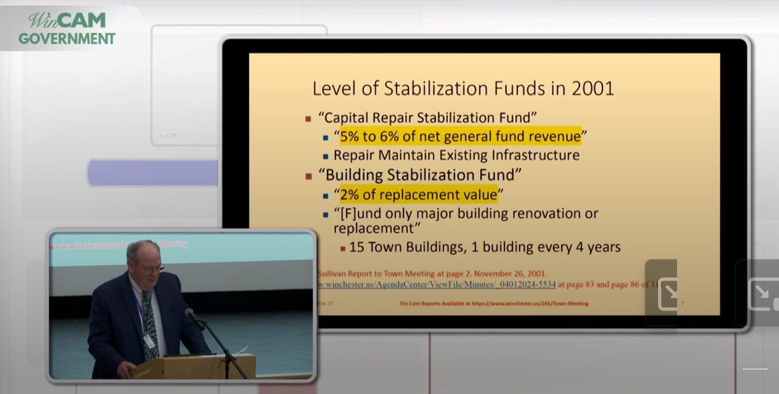 Additionally, Article 27 was indefinitely postponed by its proponent the Finance Committee. Miller said the board is looking to fix the way the town uses both the building and capital stabilization funds. He said in December 2001, former town manager Brian Sullivan presented the funds and defined how they would work.