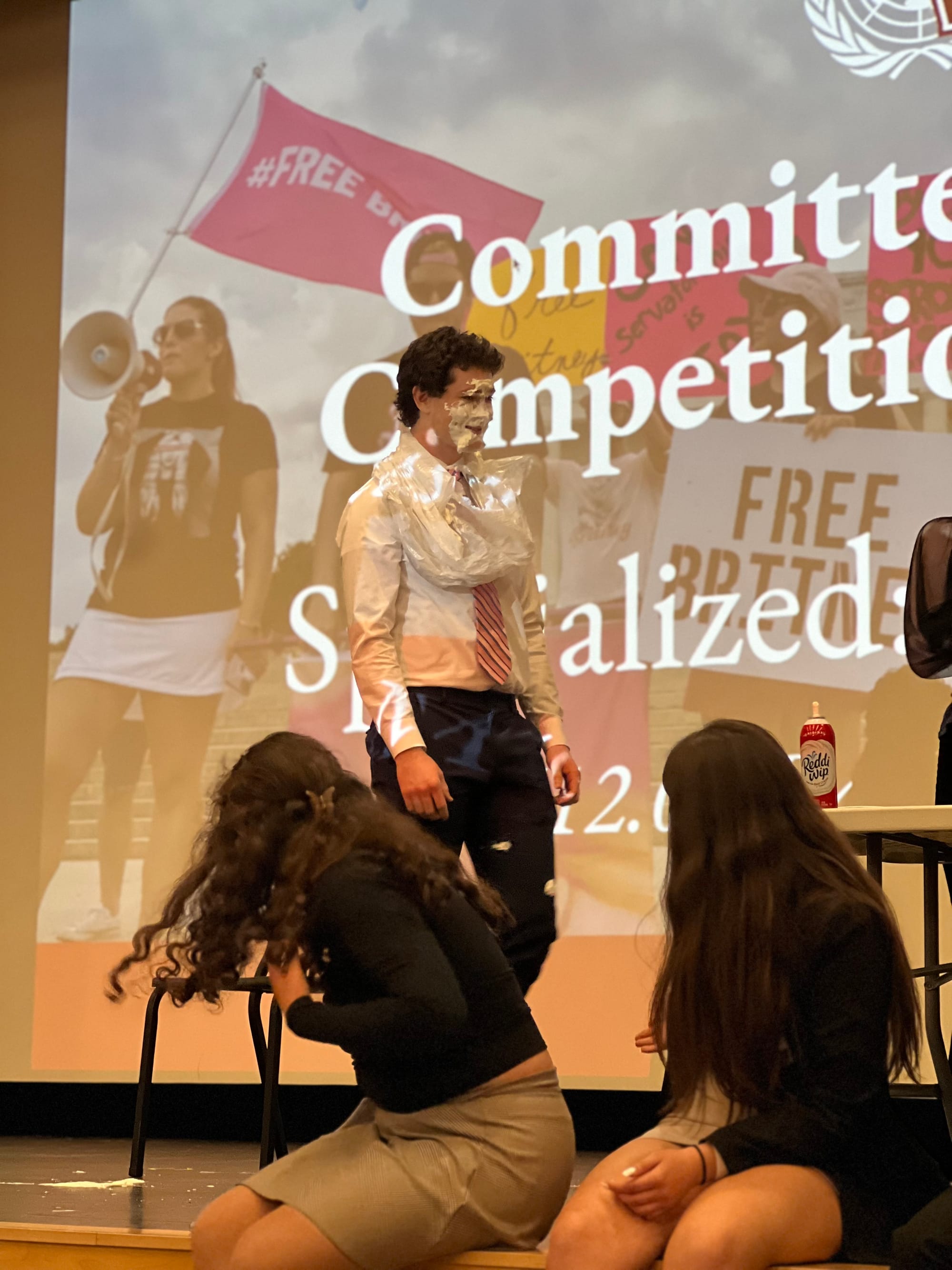 An incentive awaited each milestone to the goal — whether it be hot seat, or a prank call by the chair. The committee with the highest funds per capita had the opportunity to pie their chair in the face, which ended up being Specialized Committee Vice-Chair, Eddie Stewart!