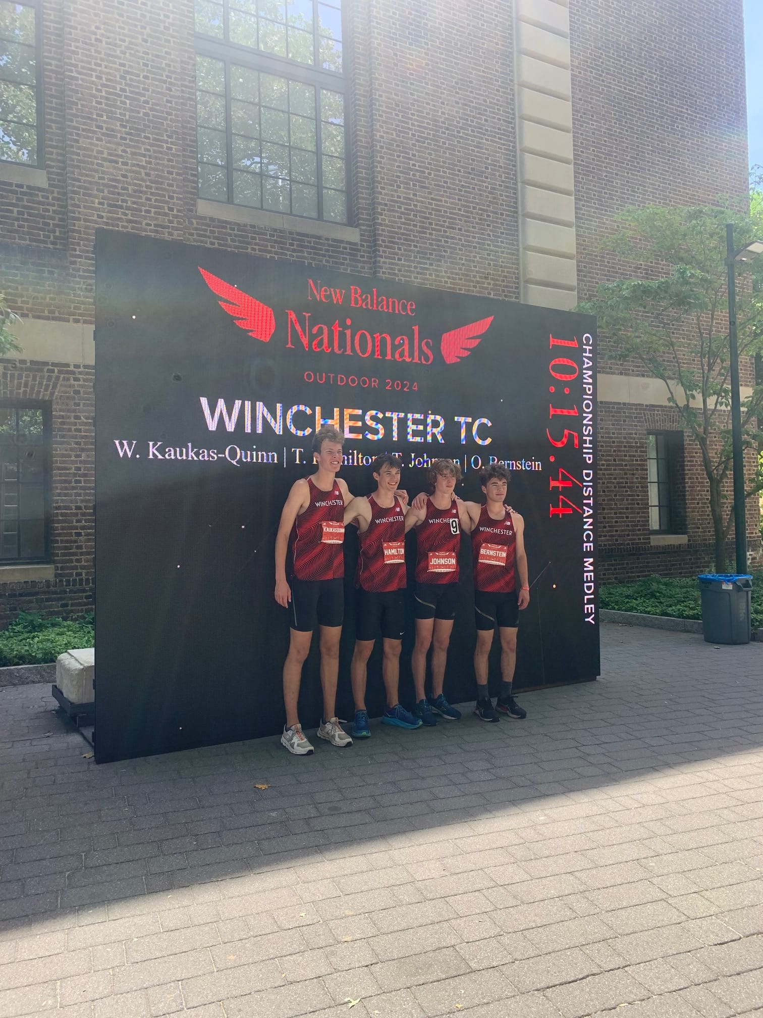 The Boys Distance Medley Relay team — Wesley Kaukas-Quinn (senior), Tim Hamilton (senior), Tyler Johnson (senior), and Owen Bernstein (junior) — finished in 21st place with a time of 10:15:44.