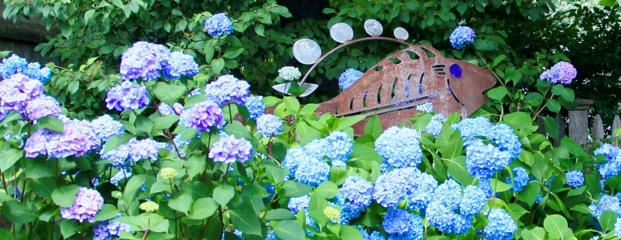 Above is a beautiful sculpture created by Whitmore Boogaerts, a talented creator down in Westport MA who produces a broad range of sculptures, functional railings and tables, and does commission work too. This sculpture is partially hidden in the season with the intent being of a fish jumping out of a blue ocean of Hydrangeas, and it holds the space, with lighting, in the dormant season. Any art can be used in this way, whether it is historical, architectural or whimsical.