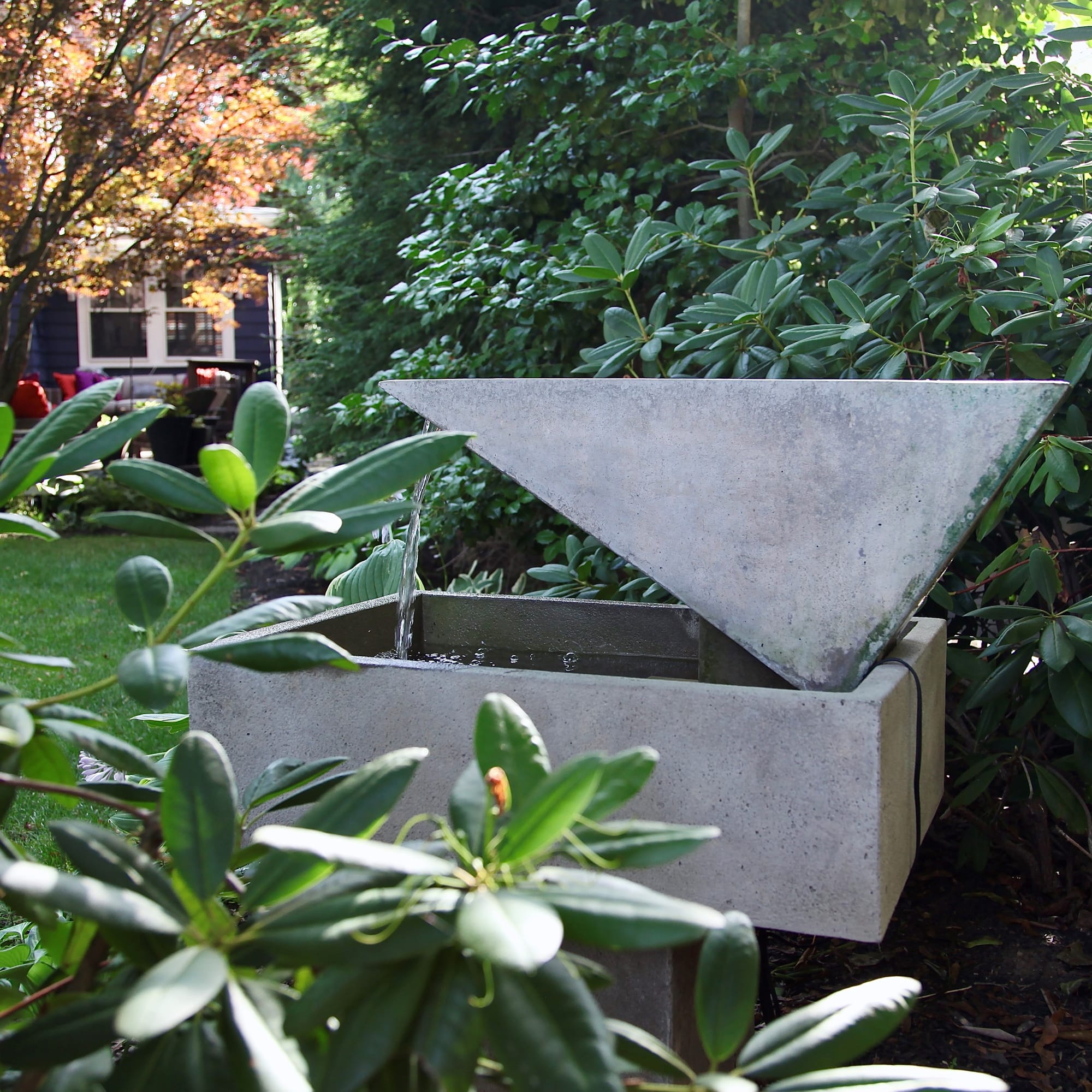 Also below, is a Campania Fountain, from a wholesale company that creates an extensive range of ornamentation for gardens. The angular and geometric design contrasts and creates order in a lush and verdant space filled with evergreen shrubs. The added element of subtle sound draws attention from anywhere in the garden. This design fit the mindset of the couple who are both engineering executives.