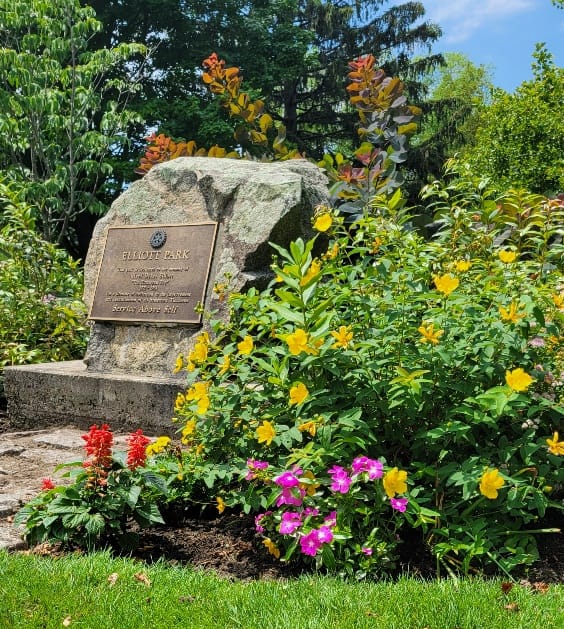 A wonderful garden that didn’t catch much attention until a couple of years ago is located in Elliott Park on the shore of Wedge Pond. The garden showcases a large granite monument and plaque that honors Alfred Dykes Elliott.