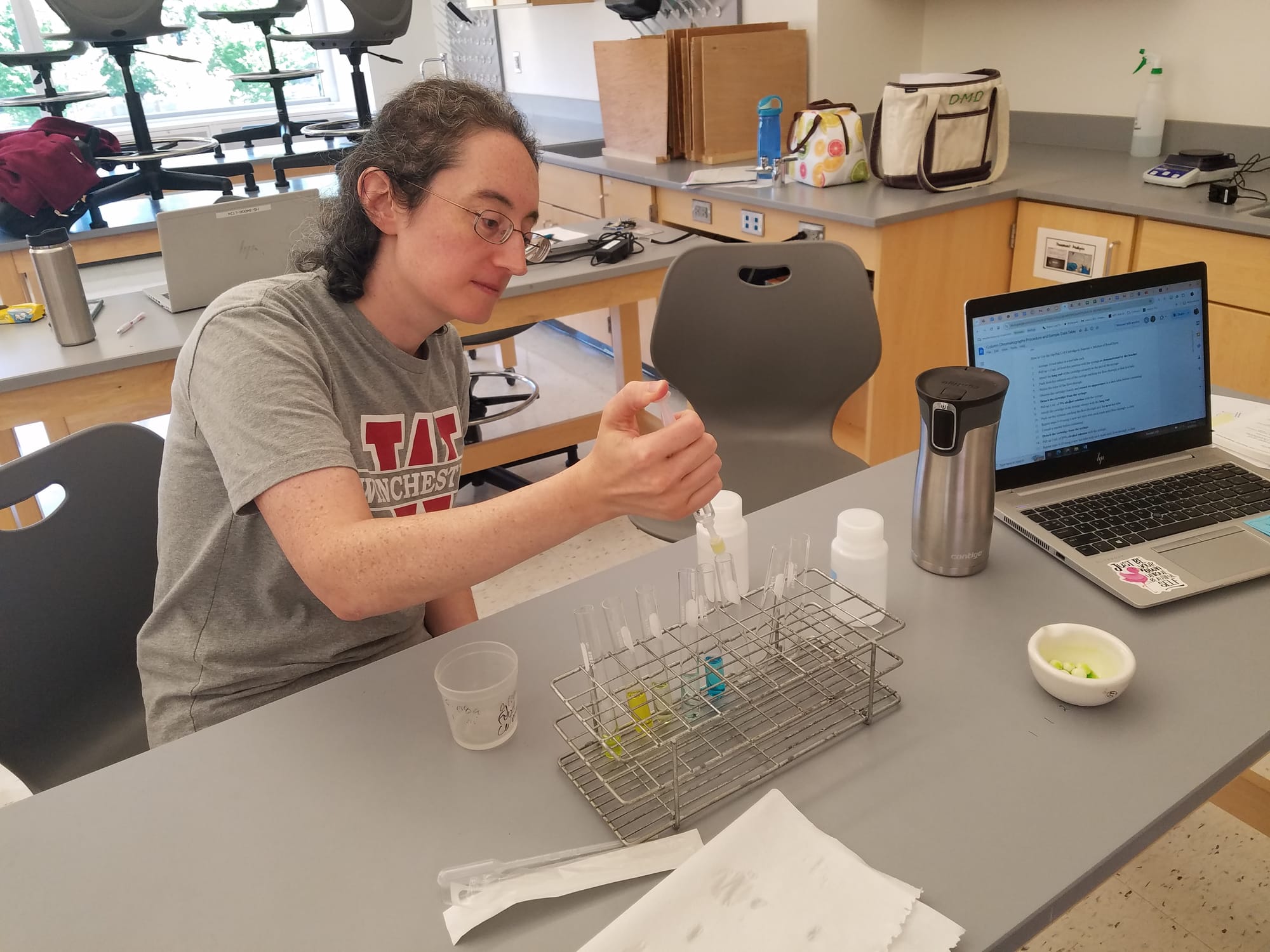 Chemistry teacher Diane Duke enthusiastically watched the liquid in her test tubes go from clear to blue and yellow. She hopes her students will have the same reactions.