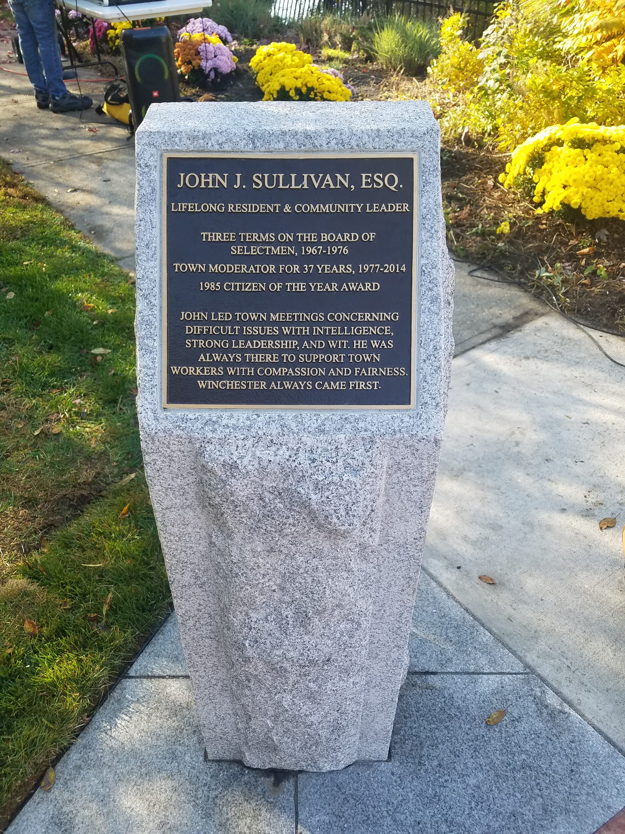 On Oct. 23, Sullivan was honored by the town with a memorial bench and plaque, as more than 50 people came together next to Town Hall for the ceremony. Friends, family, public officials, town officials and a line of town employees quietly standing in the background all praised Sullivan for his everlasting dedication to Winchester.