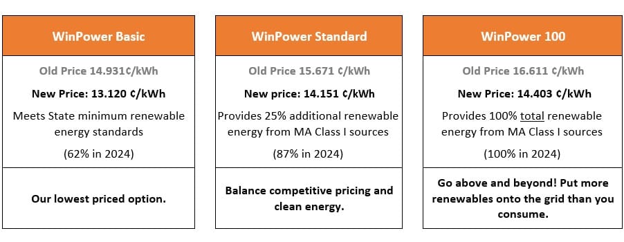 The town is excited that it has secured lower prices for all of our electricity supply options! The town has secured these lower prices, while also increasing the amount of renewable energy in the community’s default option, WinPower Standard. WinPower Standard will now provide 25% more New England-based renewable energy known as “MA Class I renewable energy.”
