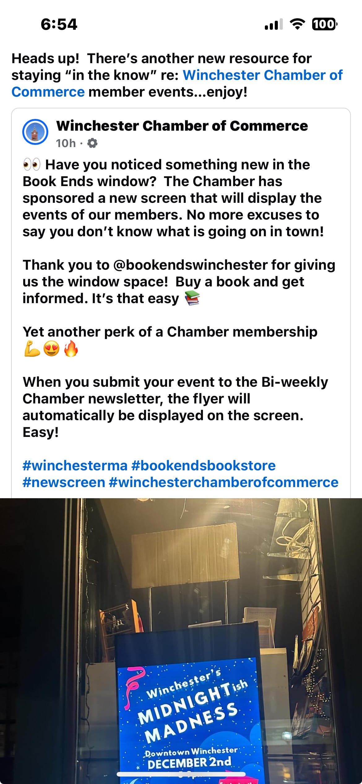 “It was a natural fit,” Garmey said, of the choice for the screen. “The owners are on the chamber board and Book Ends is a very central place. They had a window and they didn’t know what to do with the space. They get asked to put up a lot of fliers. I thought we could kill three birds with one stone.”