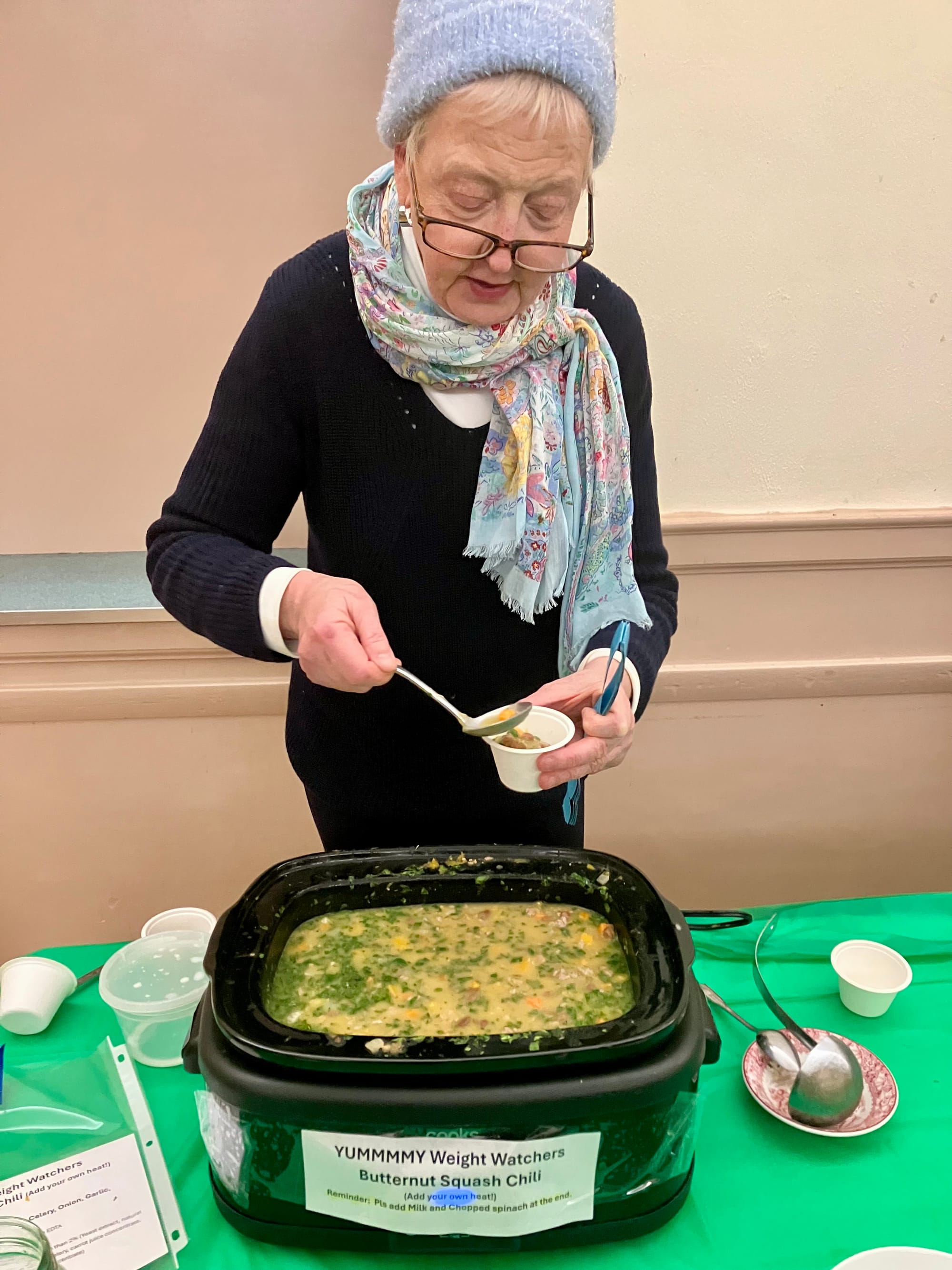 Higgins was serving up a “Yummy Weight Watchers Butternut Squash” chili, but it wasn’t one she had concocted. The cook-off was a blind tasting, which means volunteers served up chilis that were not their own so no one knew whose chili was whose.