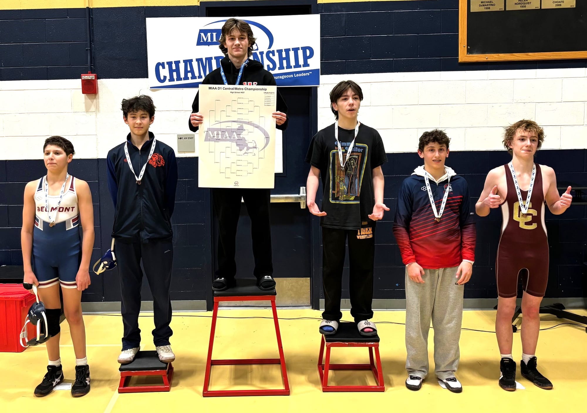 Henry Wallace (106) and Kai Napadow Baquero (113) led the way for Winchester with sectional championships last weekend, while Jack Allen (126), Eddie Donlon (132) and Ilyas Malik (165) picked up second place finishes. Yusef Ebeid (190) and Shaun Garrett (215) came in fourth in their respective weight classes to earn the right to join their aforementioned teammates at the state divisional meet.
