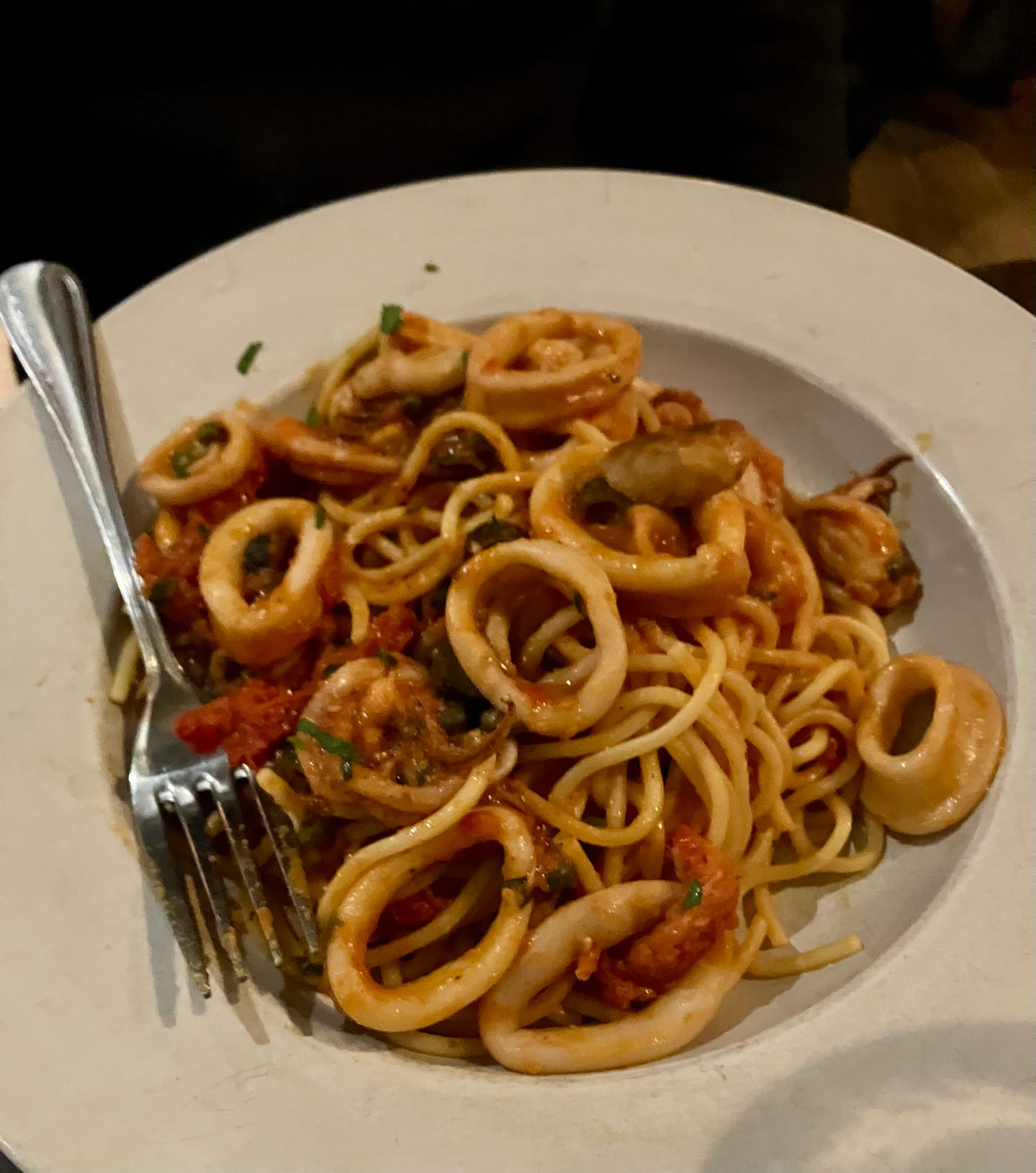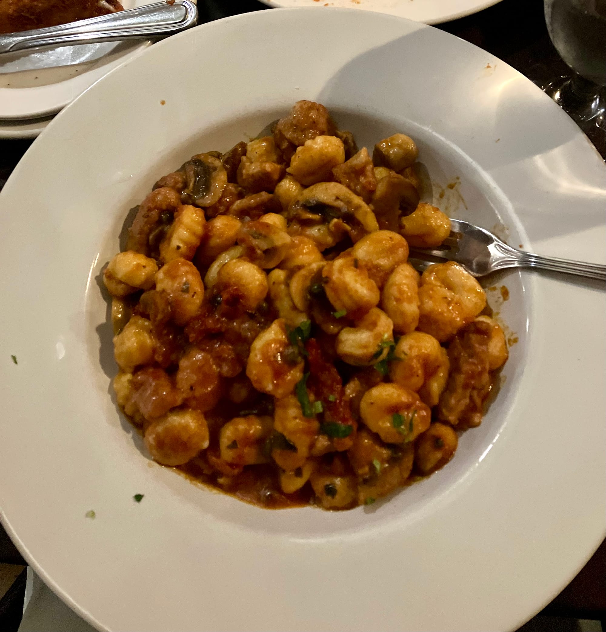 We both also considered the Pollo Lucia, boneless chicken breast sautéed with artichoke hearts and mushrooms in a light lemon sauce, which the woman next to us got and it looked delicious. But in the end I got Gnocchi Spezzatino and my husband could not resist the Calamari Pirata.