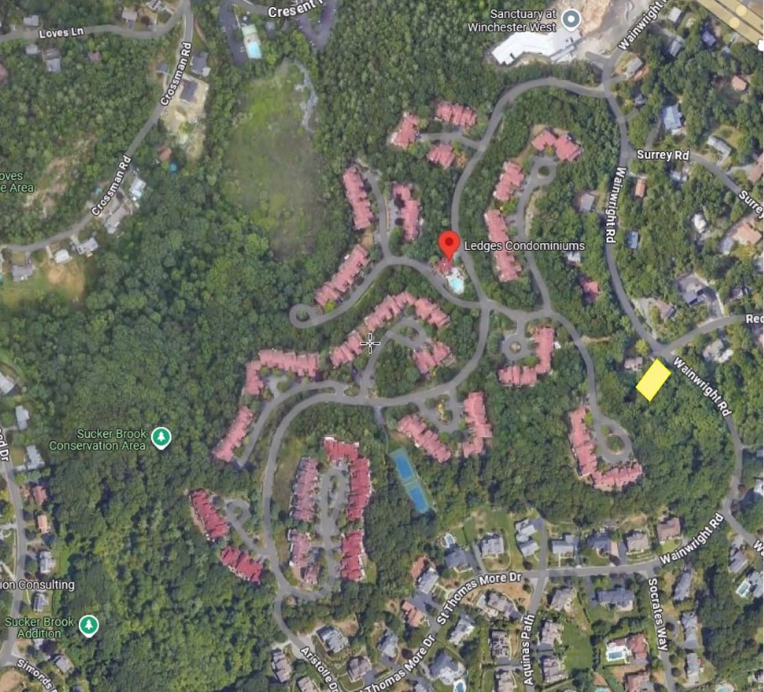 Article 6 is a citizens petition by Richard Bartels to amend Winchester zoning by changing a portion of the property at 7 Wainright Road, known as The Ledges Condominiums, from a Planned Residential District (PRD) to a Residential District A (RDA-20). The change would rezone a 20,000-square foot piece of land owned by the 40ish-year-old condominium complex so it can be developed as a single-family home.