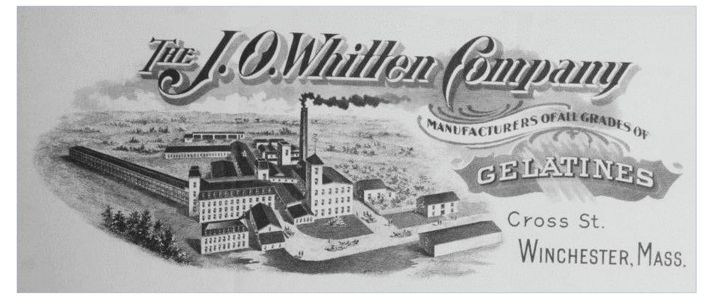 In 1902, the building was sold for the manufacture of gelatin. Across Leonard Pond from the gelatin factory, in 1915, a manufacturing plant for the Middlesex Japanning Company was built on Cross Street, next to Leonard Pond, later becoming the Allen H. McLatchy patent leather factory. In addition to the tanneries, in 1893 a factory for metallic shoe fasteners was also built along the Aberjona and, from 1903, was used for the manufacture of soda fountain works.