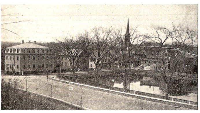 However, during the 20th century, new, smaller industries did come into town. No longer dependent on water power, they located away from the river and brook. For example, in the Waterfield Building on Waterfield Road in the Center were the Winslow Press and Hanlon Locomotive Sander Company, both there at the time of the 1945 fire. An apron factory occupied the former YMCA gym in the White Block on Mt. Vernon Street for some time.