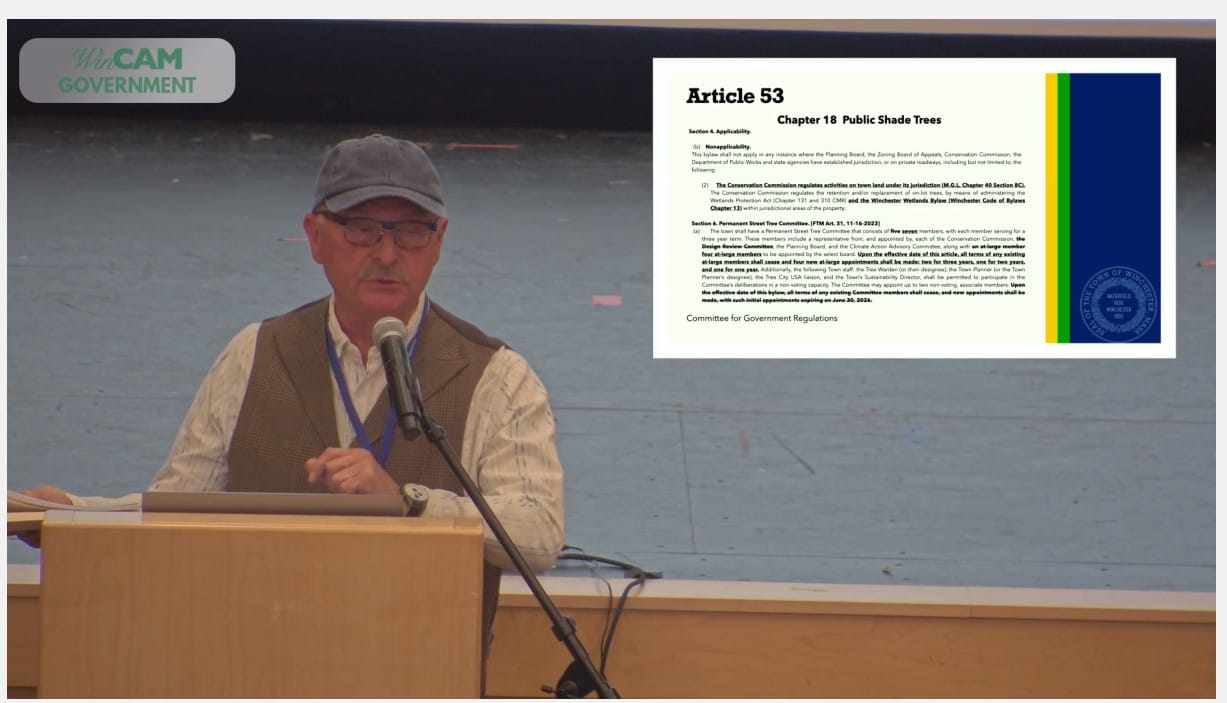 Article 53, which would amend certain subsections of Chapter 18 – Public Shade Trees, addressed the need by the Permanent Tree Street Committee to make changes in its membership by changing from five to seven people and removing representatives from the Design Review Committee.