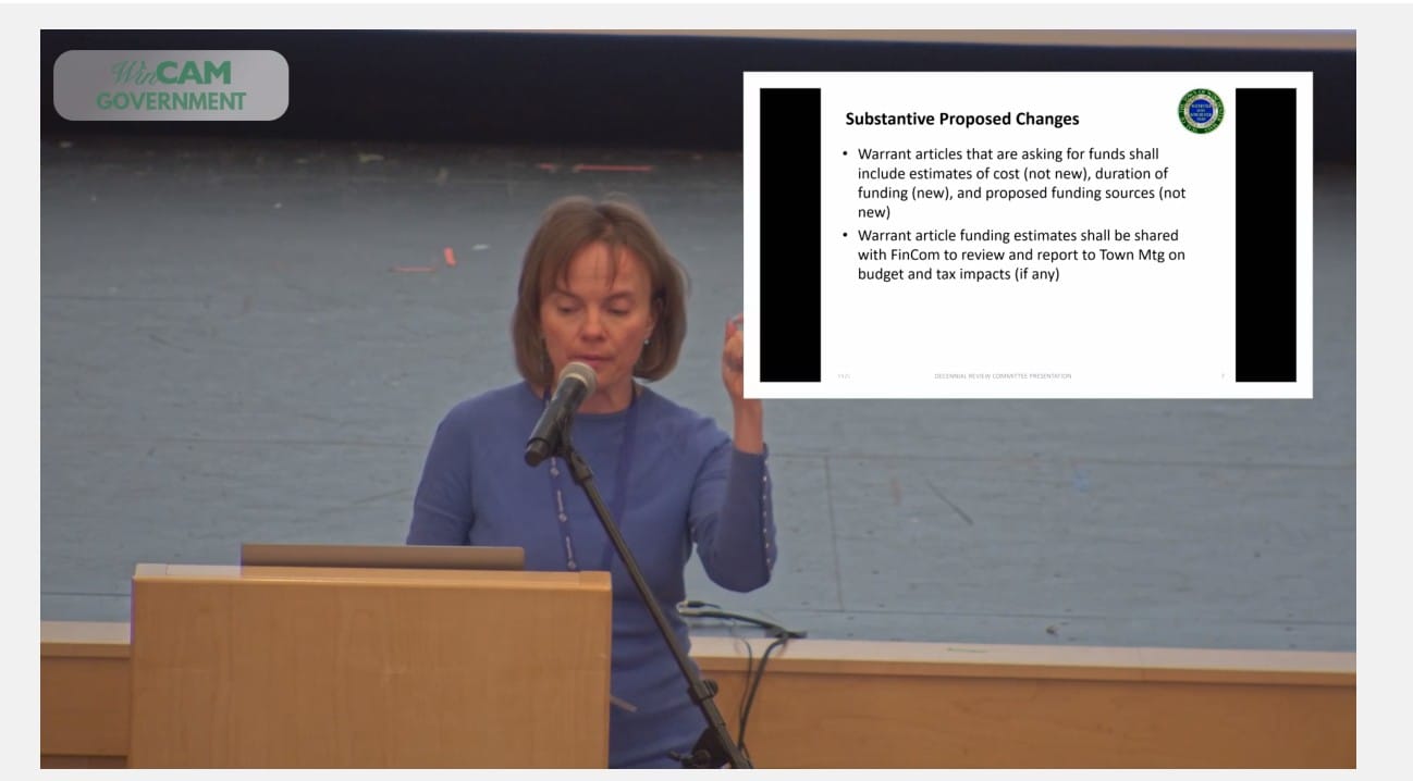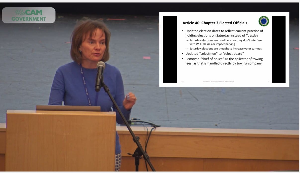 Blackwell also gave her take on what she called non-substantive changes, such as posting Town Meeting notices on the town website and removing the Human Services Committee and Committee for Equal Opportunity, both of which are inactive and have not met in years.