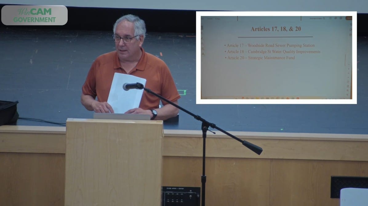 Articles 17 and 18, which asked for $1.5 million to remodel and repair the Woodside Road Pumping Station and $800,000 make improvements to the water system on Cambridge Street and the surrounding area, were also passed.