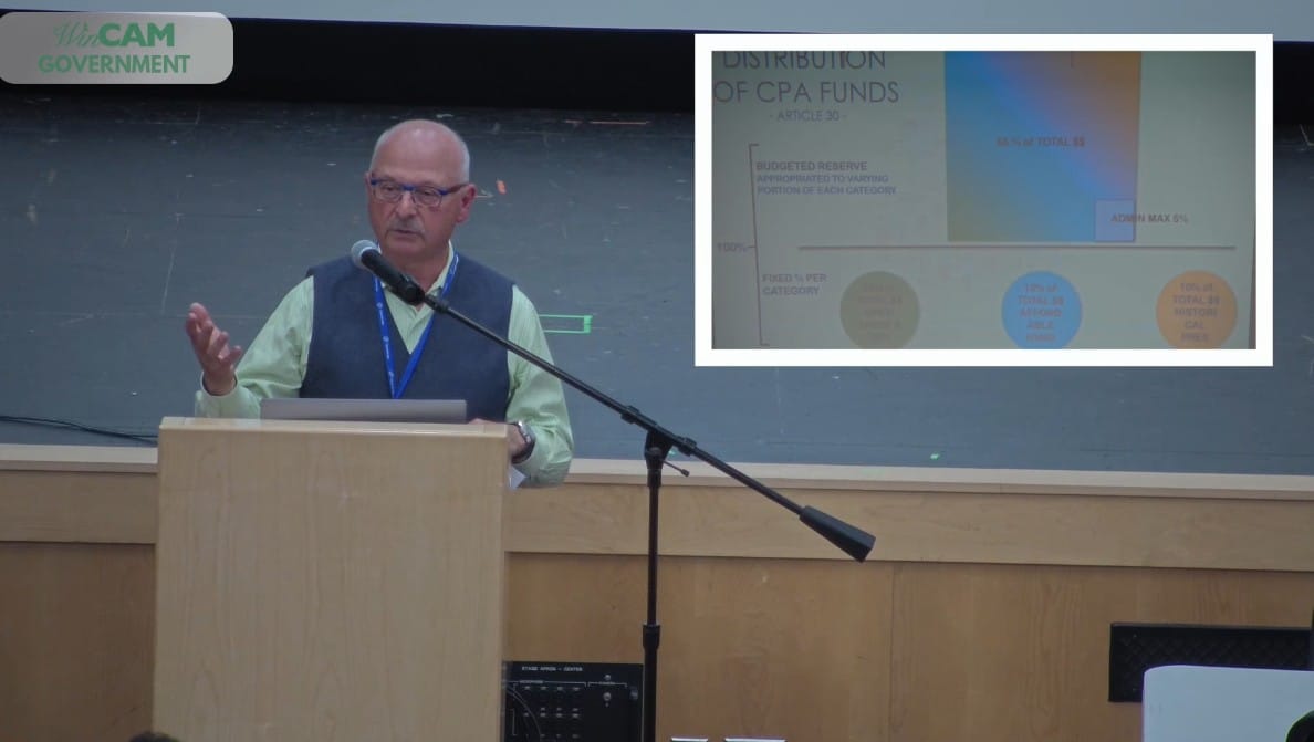 David Miller did double duty as chair of both the Community Preservation Committee and the Permanent Street Tree Committee during the first session of Town Meeting. WINCHESTER NEWS/WINCAM PHOTOS/NELL ESCOBAR COAKLEY