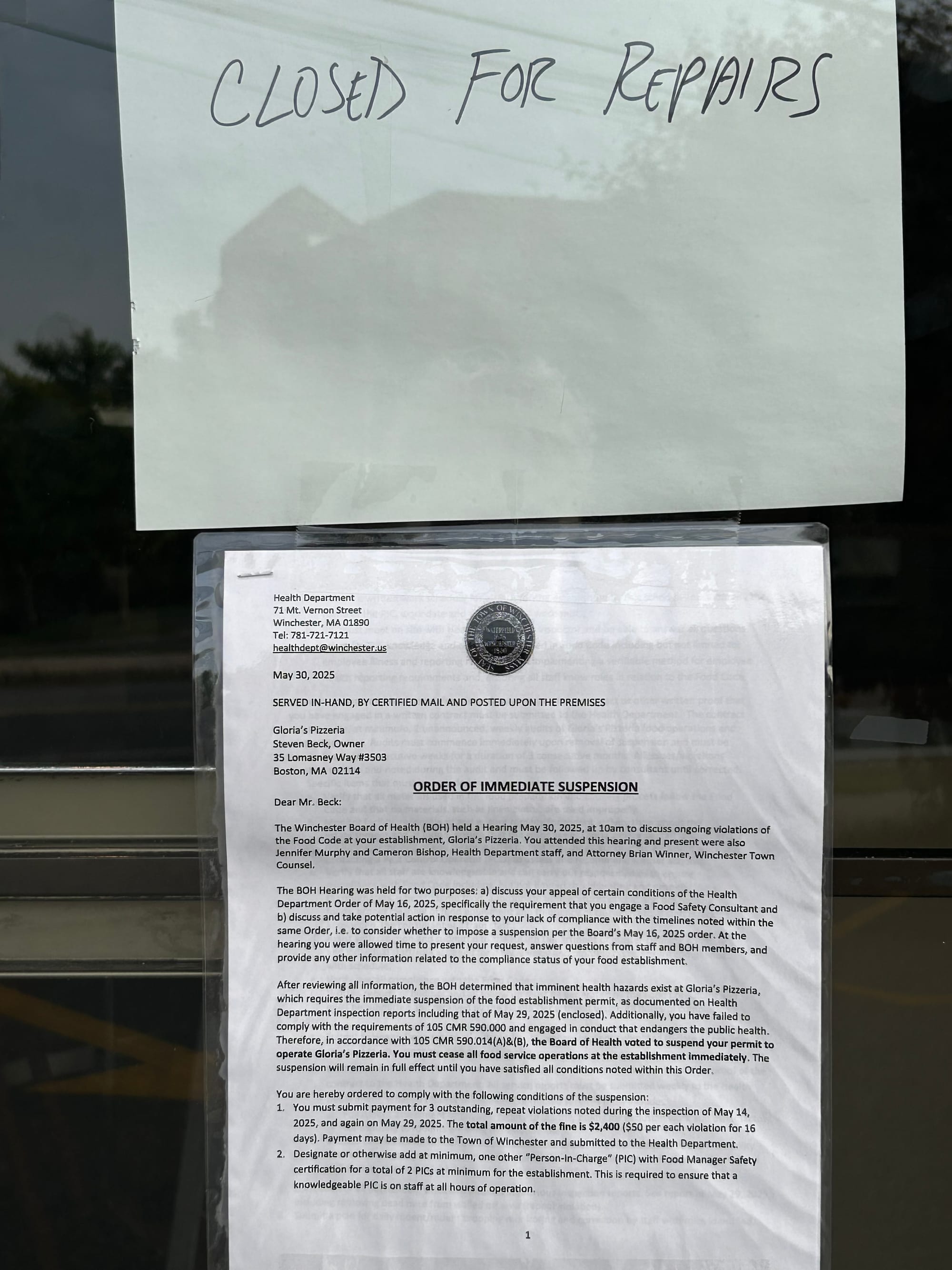 The letter stated the “Board of Health voted to suspend your permit to operate Gloria’s Pizzeria. You must cease all food service operations at the establishment immediately. The suspension will remain in full effect until you have satisfied all conditions noted within this Order.”