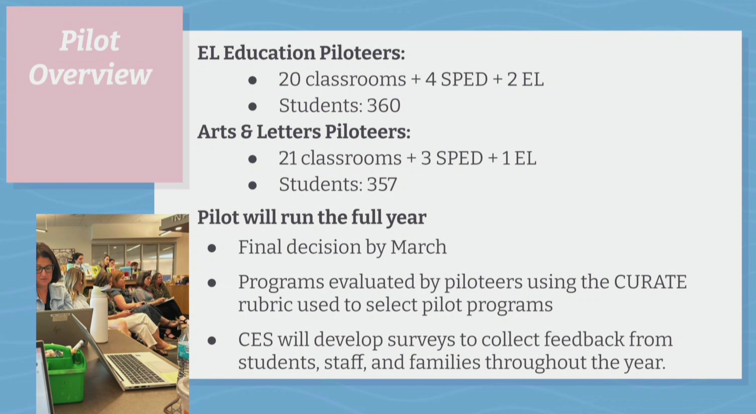 West said 20 classrooms would pilot EL Education and 21 classrooms would pilot the Arts & Letters program. Both groups of piloteers include special education and English learner students in the mix.