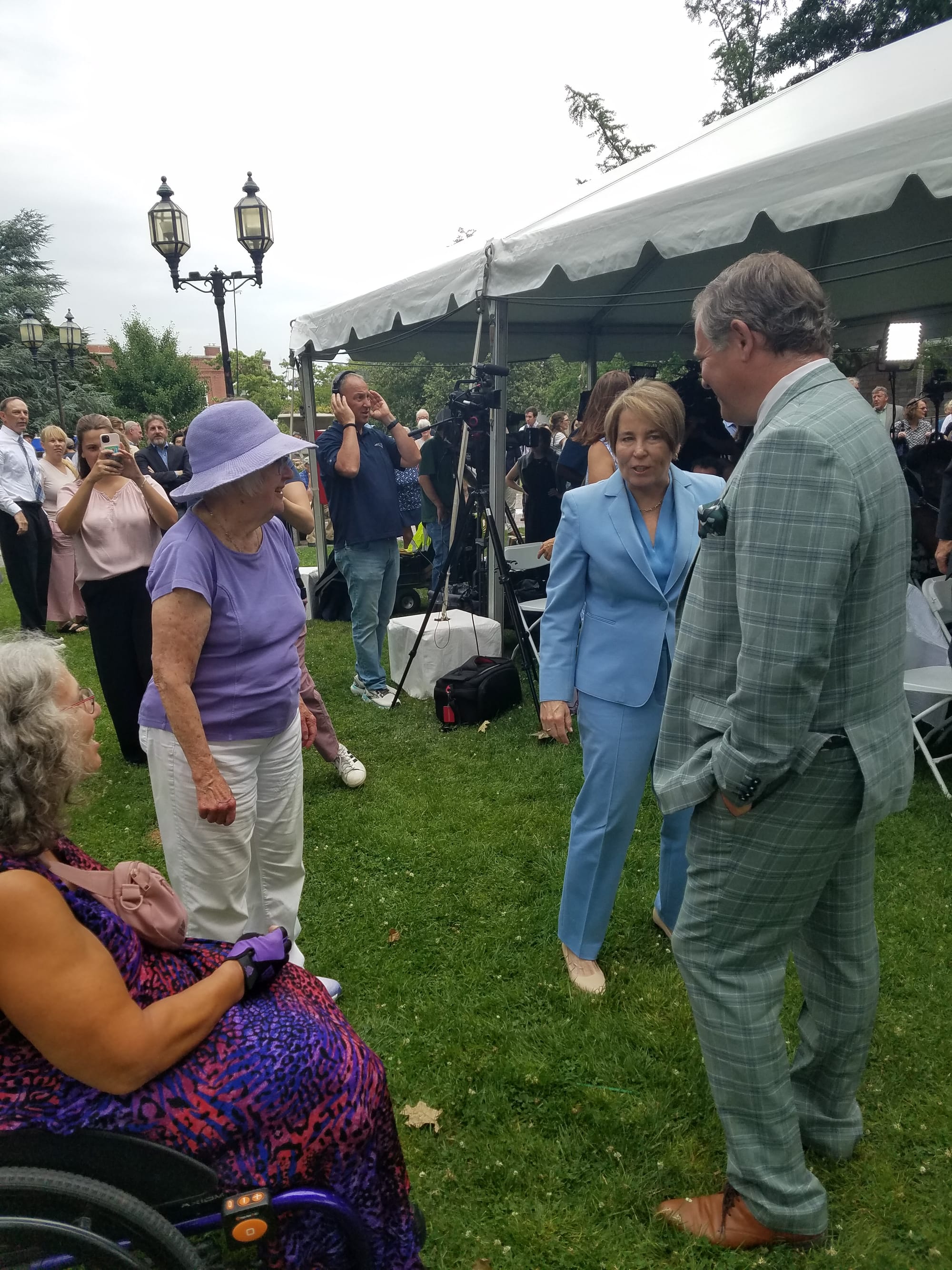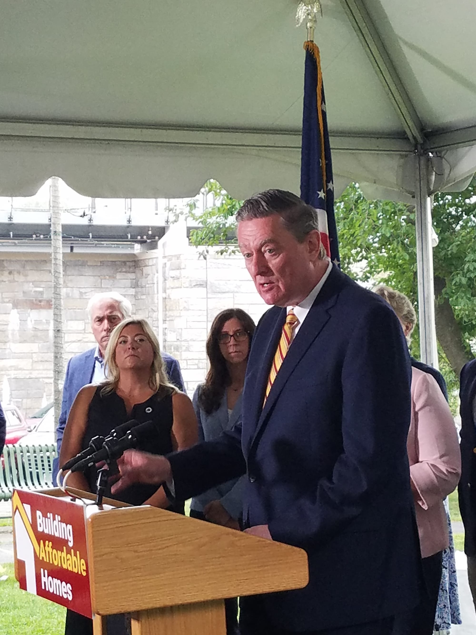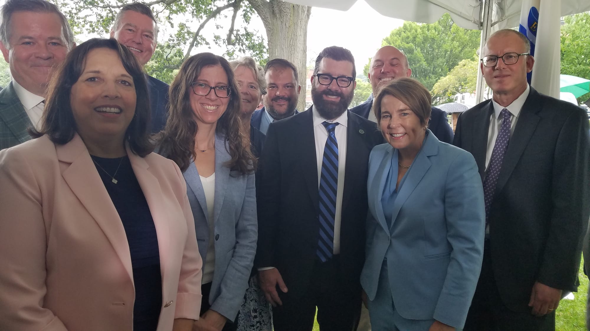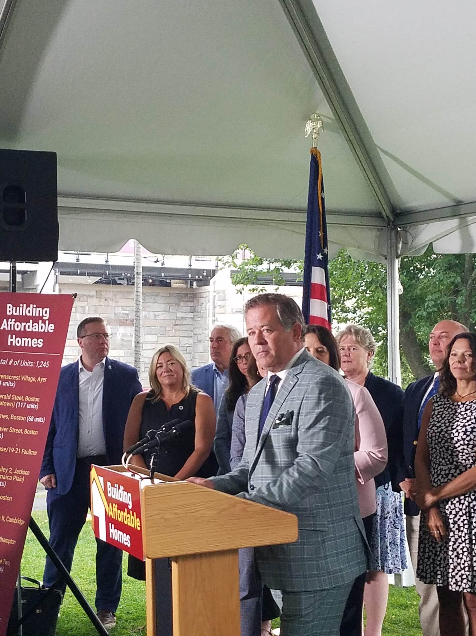 Healey, along with Lt. Gov. Kim Driscoll and Mass. Secretary of Housing Ed Augustus Jr., arrived on the town common shortly after 10 o’clock on July 31 to announce affordable housing tax credits and subsidies for projects that had been approved throughout the state, including Waterfield Commons in Winchester.