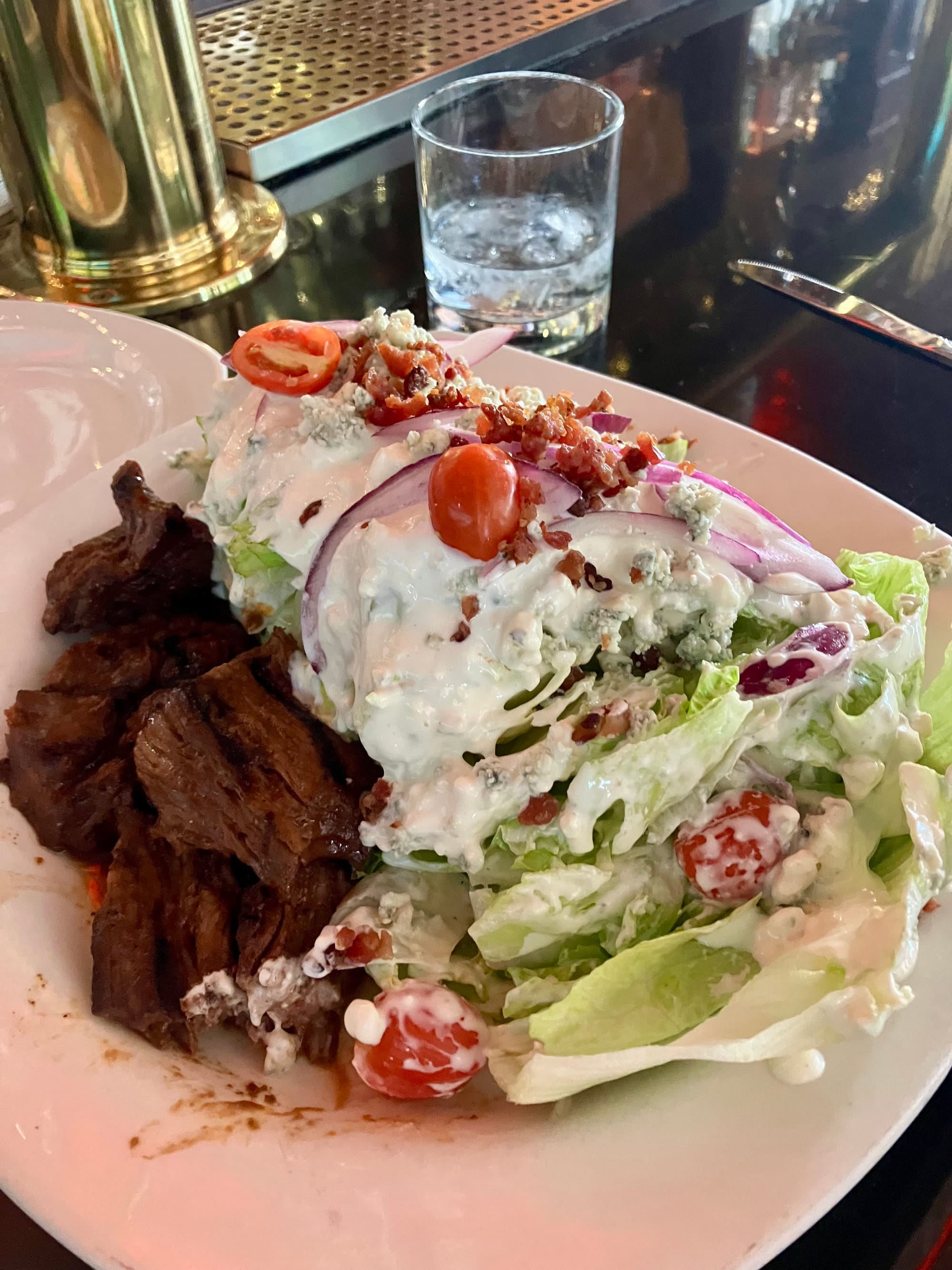 The steak tip wedge salad was ridiculous and I mean that in a nice way. It was huge — HUGE! It wasn’t a wedge, it was an entire half a head of lettuce drizzled with blue cheese dressing and covered in all manner of things that make a salad great, like grape tomatoes, bacon pieces, and even more blue cheese of the crumbled variety.
