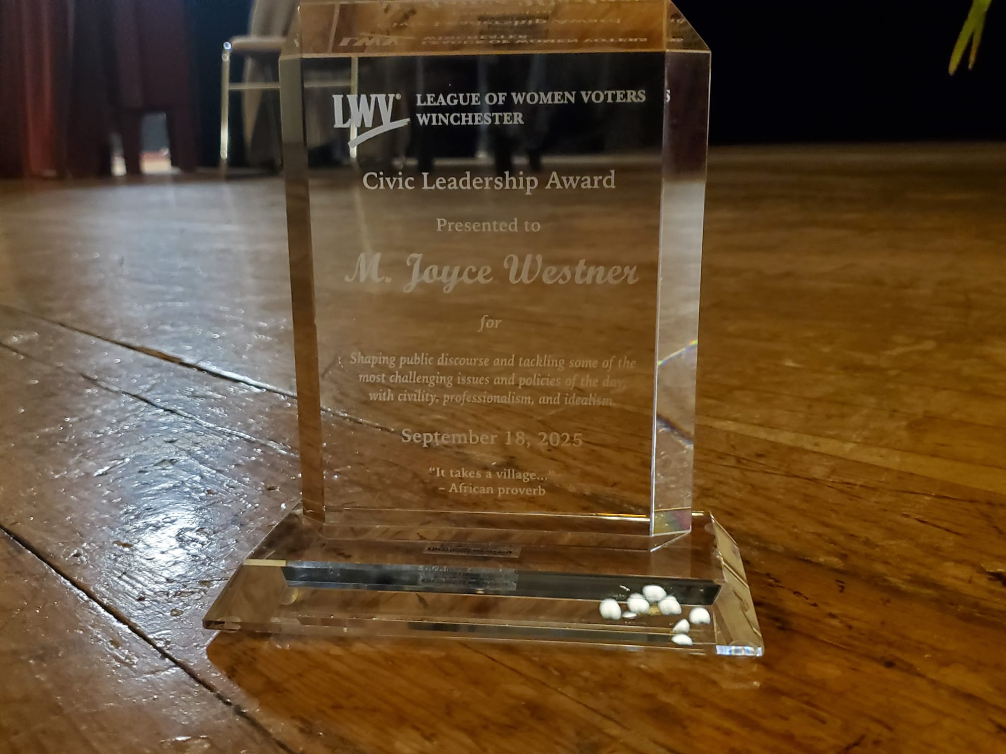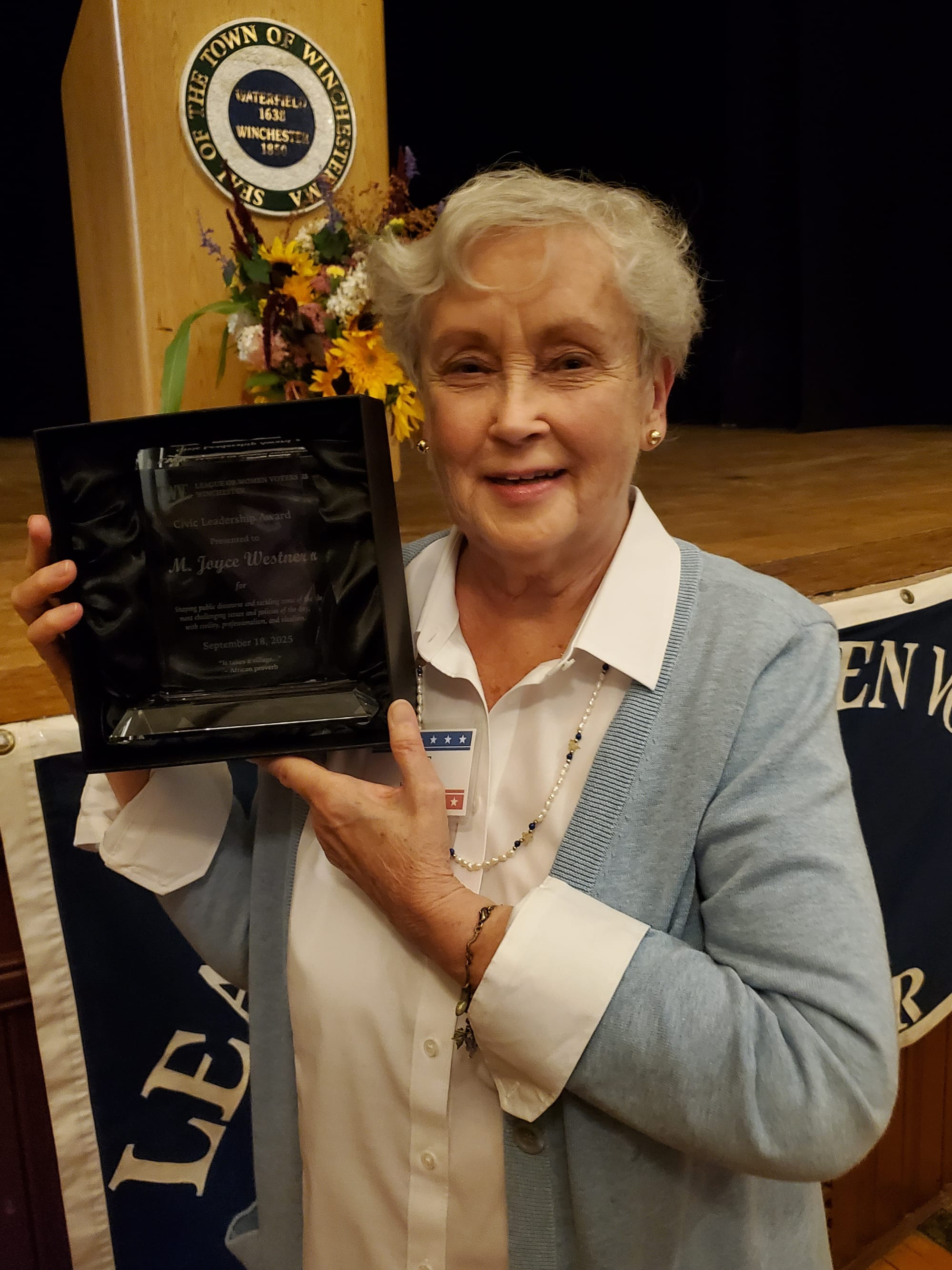 And on Sept. 18, the League of Women Voters of Winchester awarded her the 2025 Civic Leadership Award for the “tremendous service to our community, bringing idealism balanced with professionalism to shape public discourse in a civil fashion” during a ceremony at Town Hall.