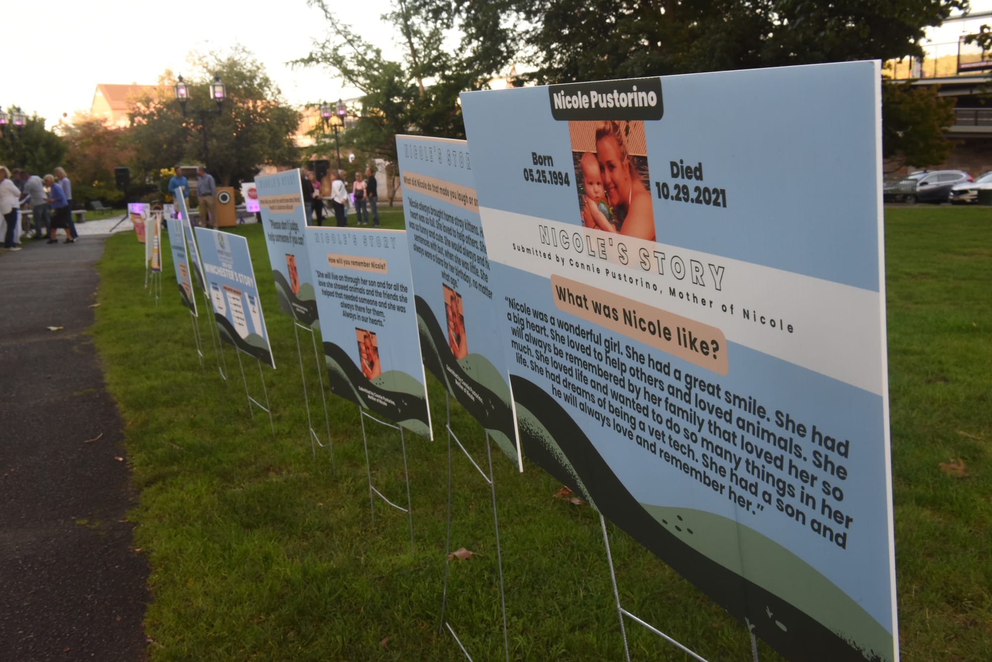 Winchester residents and vigil attendees check out the placards set up at the town common during the Recovery & Remembrance Candlelight Vigil on Sept. 30. WINCHESTER NEWS STAFF PHOTOS/RICHARD HOWARD