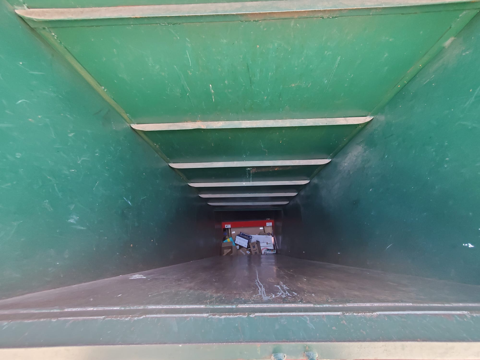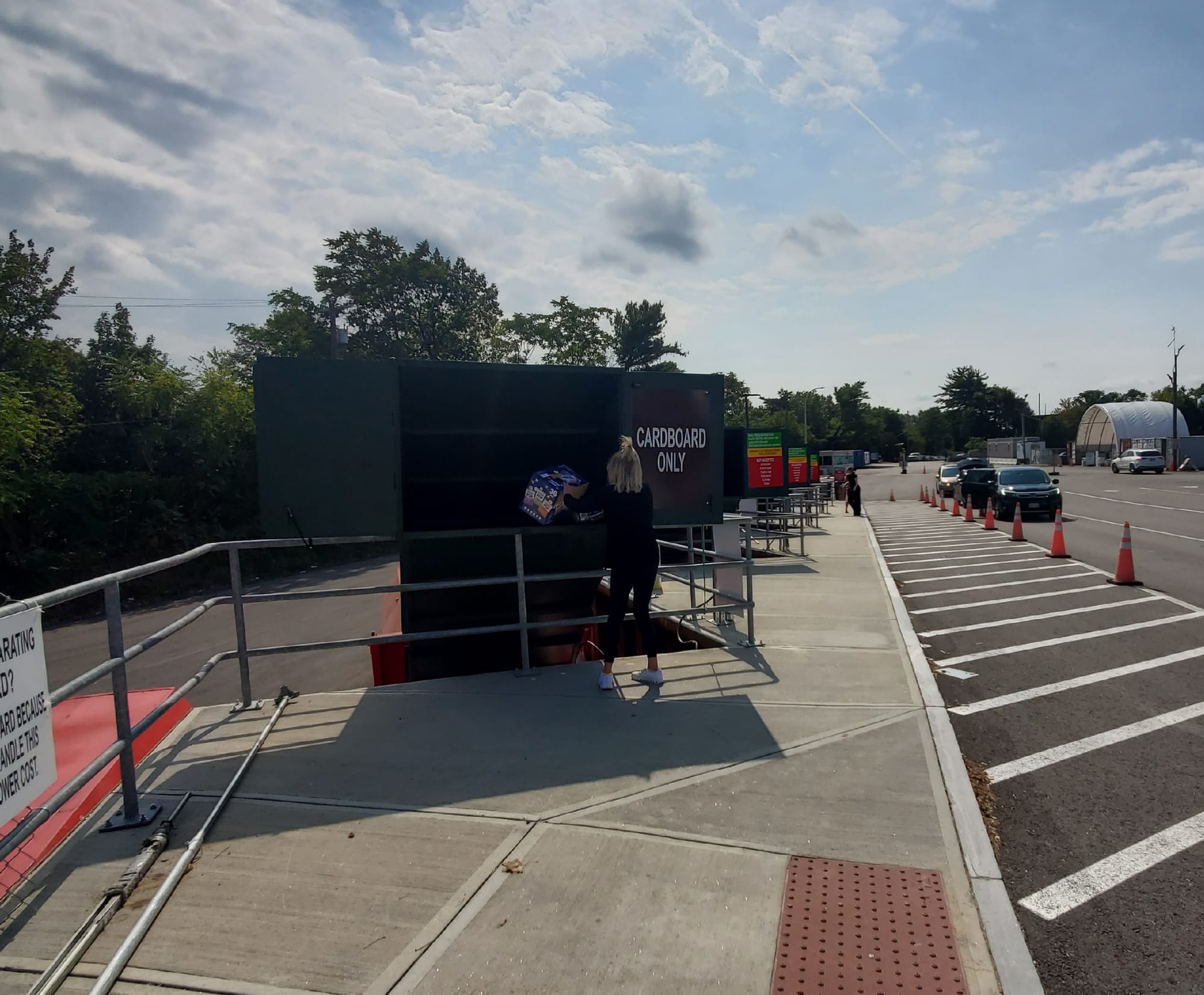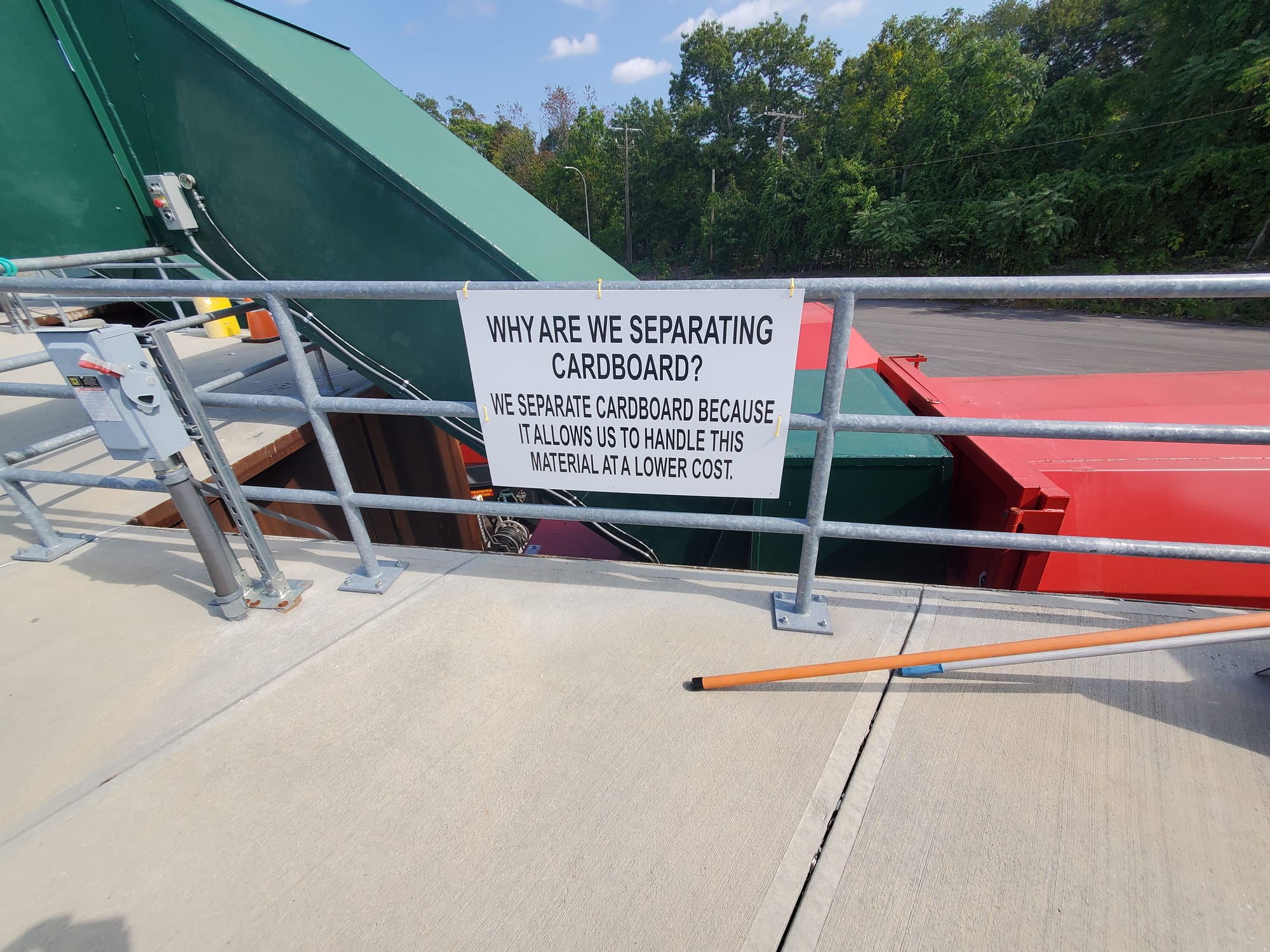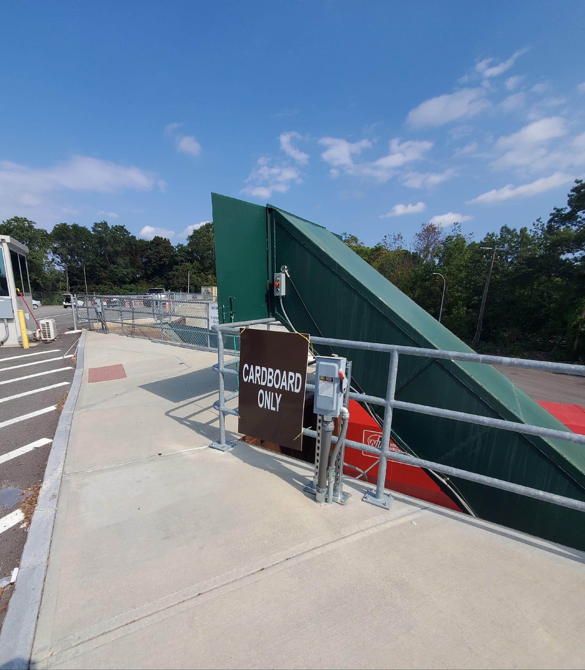 The transfer station has four single-stream compactors, where residents can dispose of all their materials without sorting them out first for recycling. The cardboard-only compactor is in the fourth position because it is the closest compactor to the recycling attendant booth. The attendant can manage and catch any material that is not supposed to go into the cardboard-only recycling.