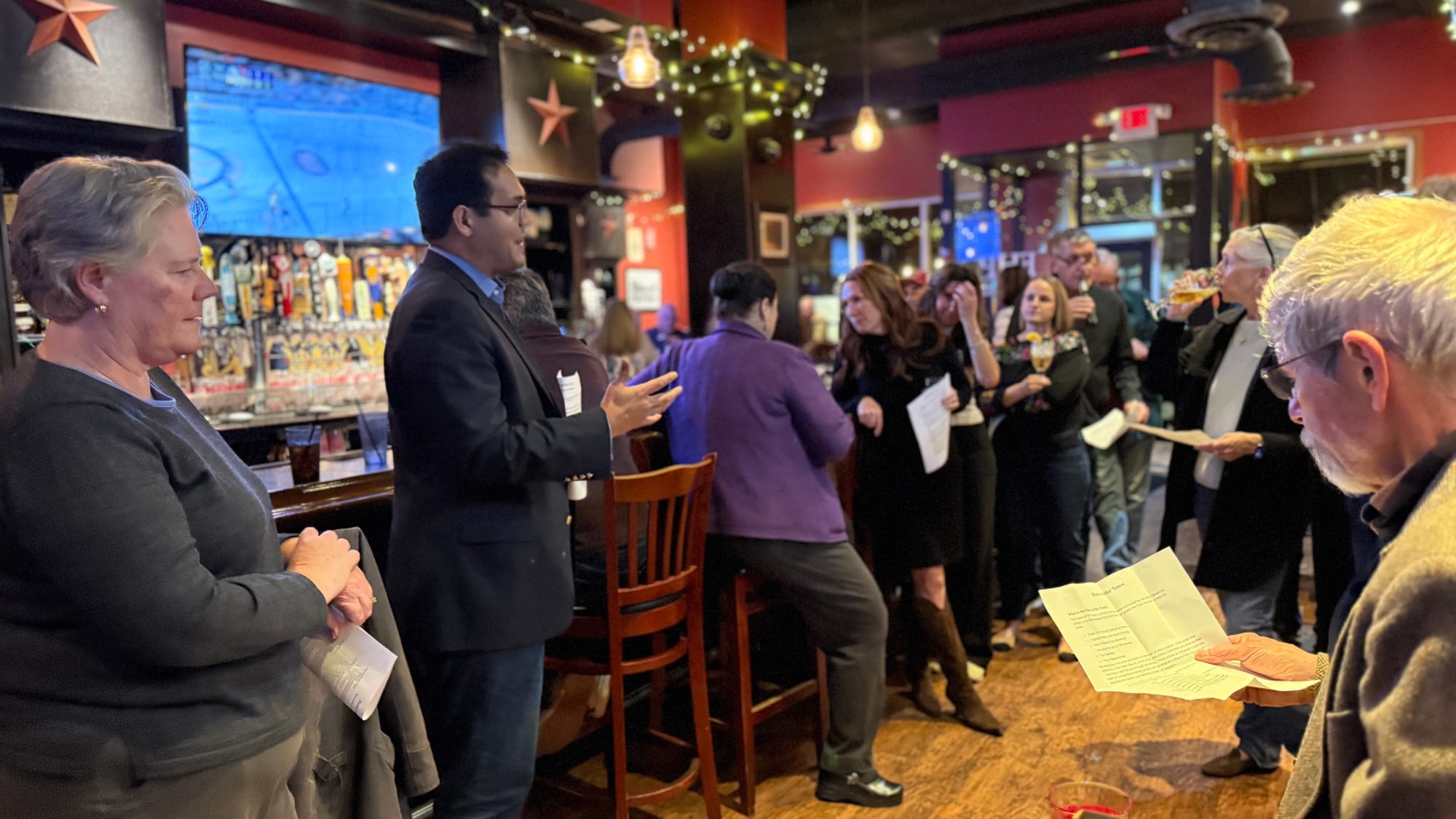 Paras Bhayani and Michelle Prior presented updates from the State of the Town Committee to about 50 residents at the First House Pub at 528 Main St., emphasizing that the process goes far beyond simply identifying budget gaps and proposing tax increases.