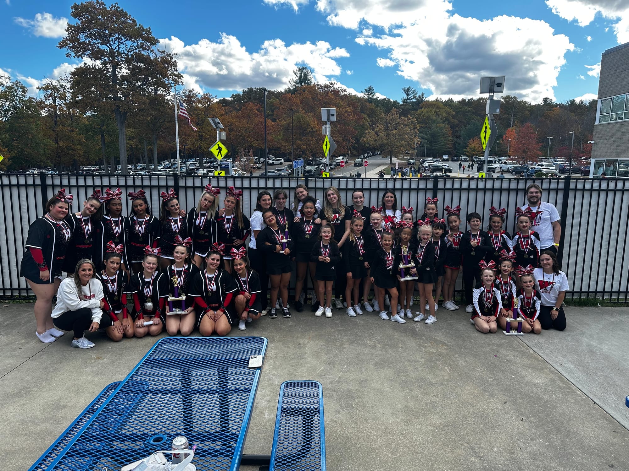 The local tournaments are at Woburn High School, league tournaments are in Methuen, and winners compete in Springfield. Judges look for overall performance and choreography: jumps, tumbling, gymnastics, stunts and dance.