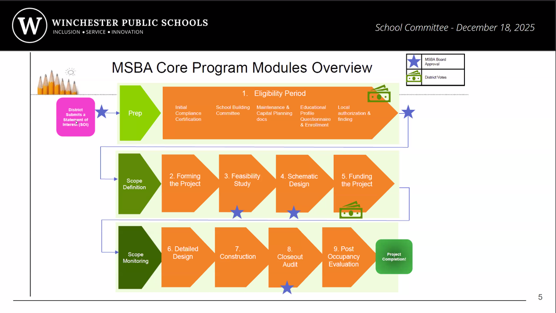 The MSBA works with communities to plan, design and build, or sometimes renovate schools and they provide funding to support those projects. The state invited the district into the eligibility period, the first module of what is typically a lengthy process to get to a new building.