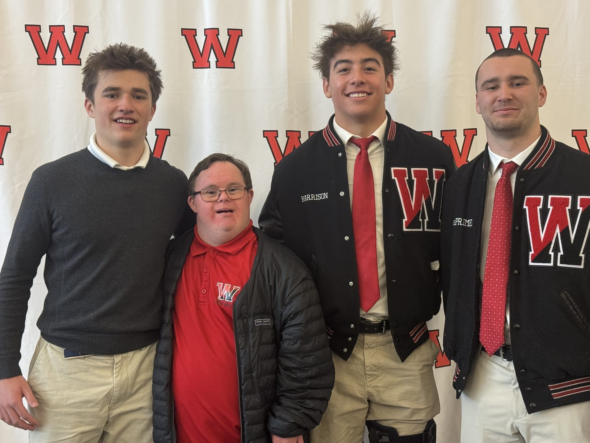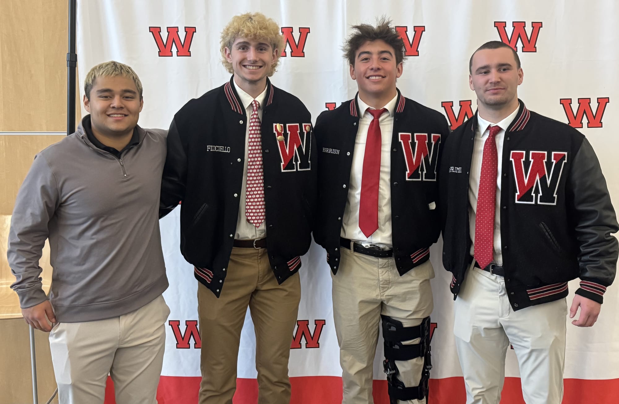 Left, Winchester High football seniors with the team’s general manager John Dunleavy. They are, from left, senior Tommy Donlon, Dunleavy, and senior captains Bryan Harrison and Gianni DePrimeo. Right, senior captains Lucas Sekino, Michael Ficociello, Bryan Harrison and Gianni DePrimeo, from left, pose for a photo during the annual awards banquet. COURTESY PHOTOS/MAI HARRISON