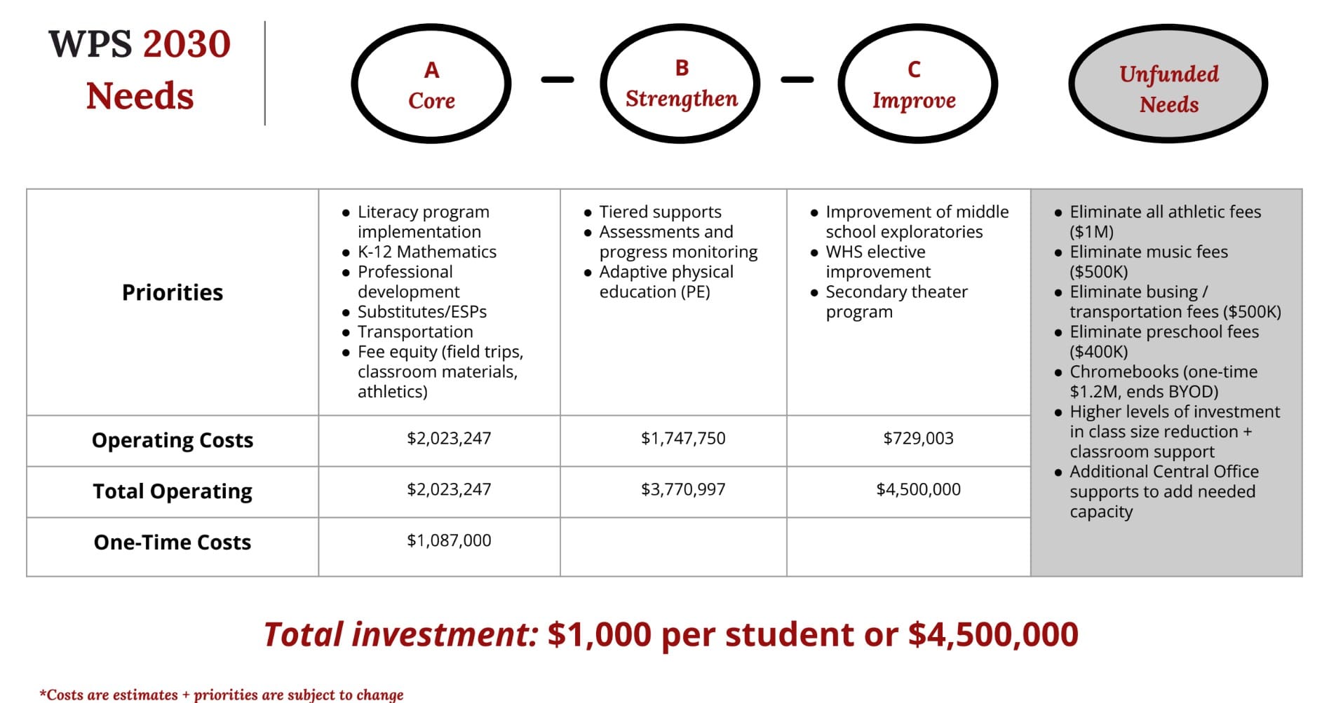 A separate unfunded-needs list includes eliminating athletic, music, transportation and preschool fees — roughly $2.4 million in total — as well as other items, such as replacing the bring-your-own-device policy with district-issued Chromebooks and adding central office staffing.