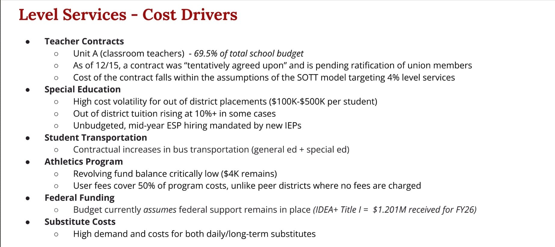 Officials said the district’s level-services budget — maintaining current programming without enhancements — has grown about 5.5% annually in recent years, driven largely by salaries, benefits, special education costs and transportation.