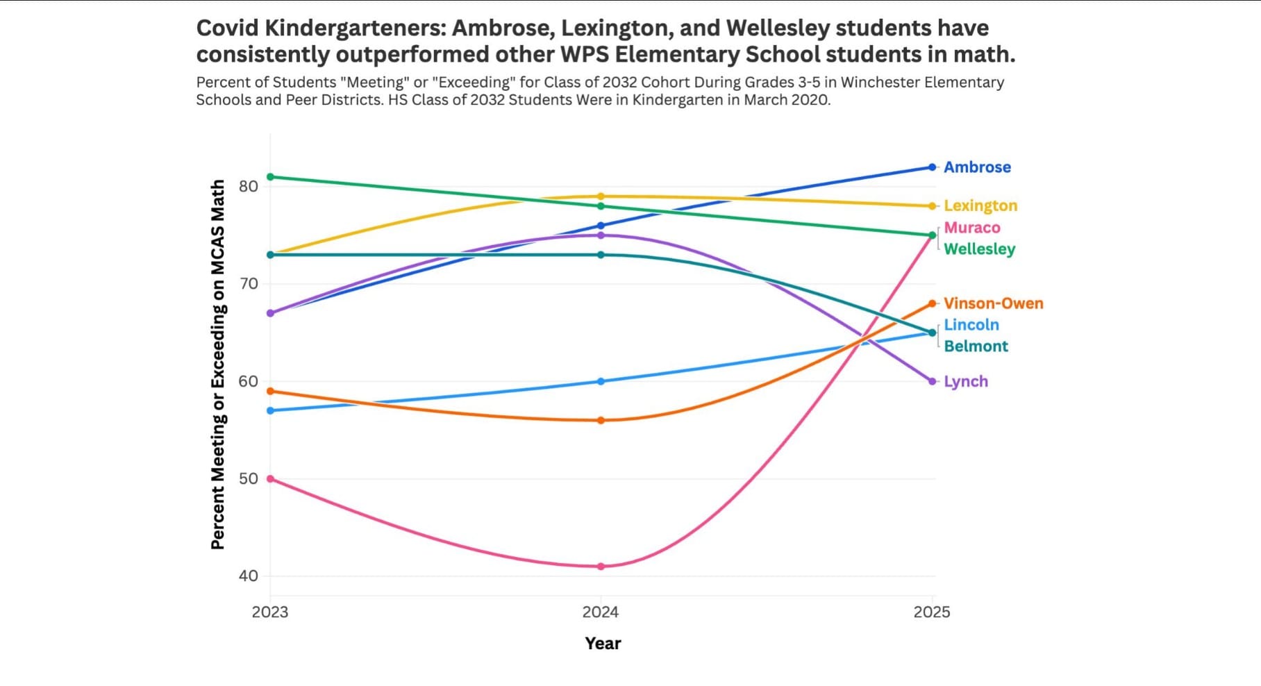 Superintendent Dr. Frank Hackett and School Committee member Timothy Matthews pointed to data showing that students who were in Kindergarten during the March 2020 closures have experienced steeper learning loss than peers in districts such as Lexington, Belmont and Wellesley.