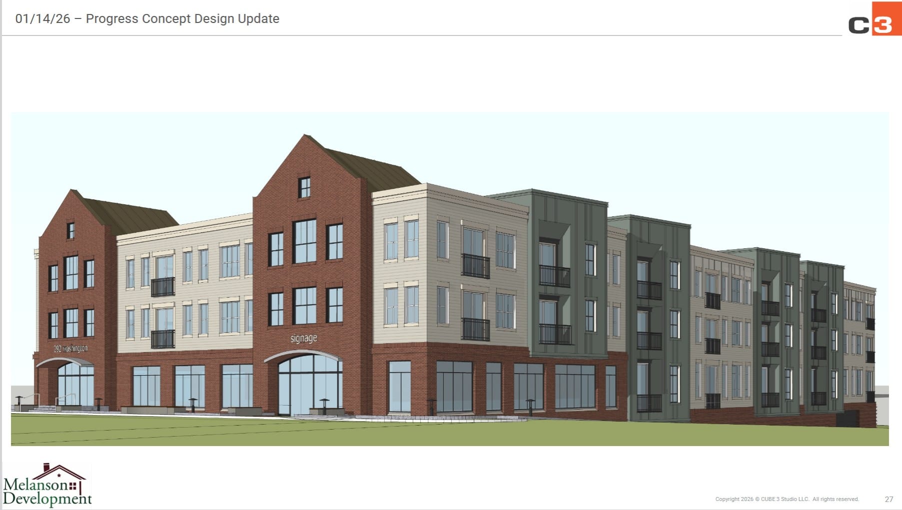 Earlier in the meeting, MDG architects Michelle Quinn Littlefield and Mark Radner briefed the Board Appeals on details of the site plan, including its appearance and landscaping. Littlefield showed renderings of the bushings with different sections in different colors and textures, including red brick and gray-green paint over an as yet undetermined material.