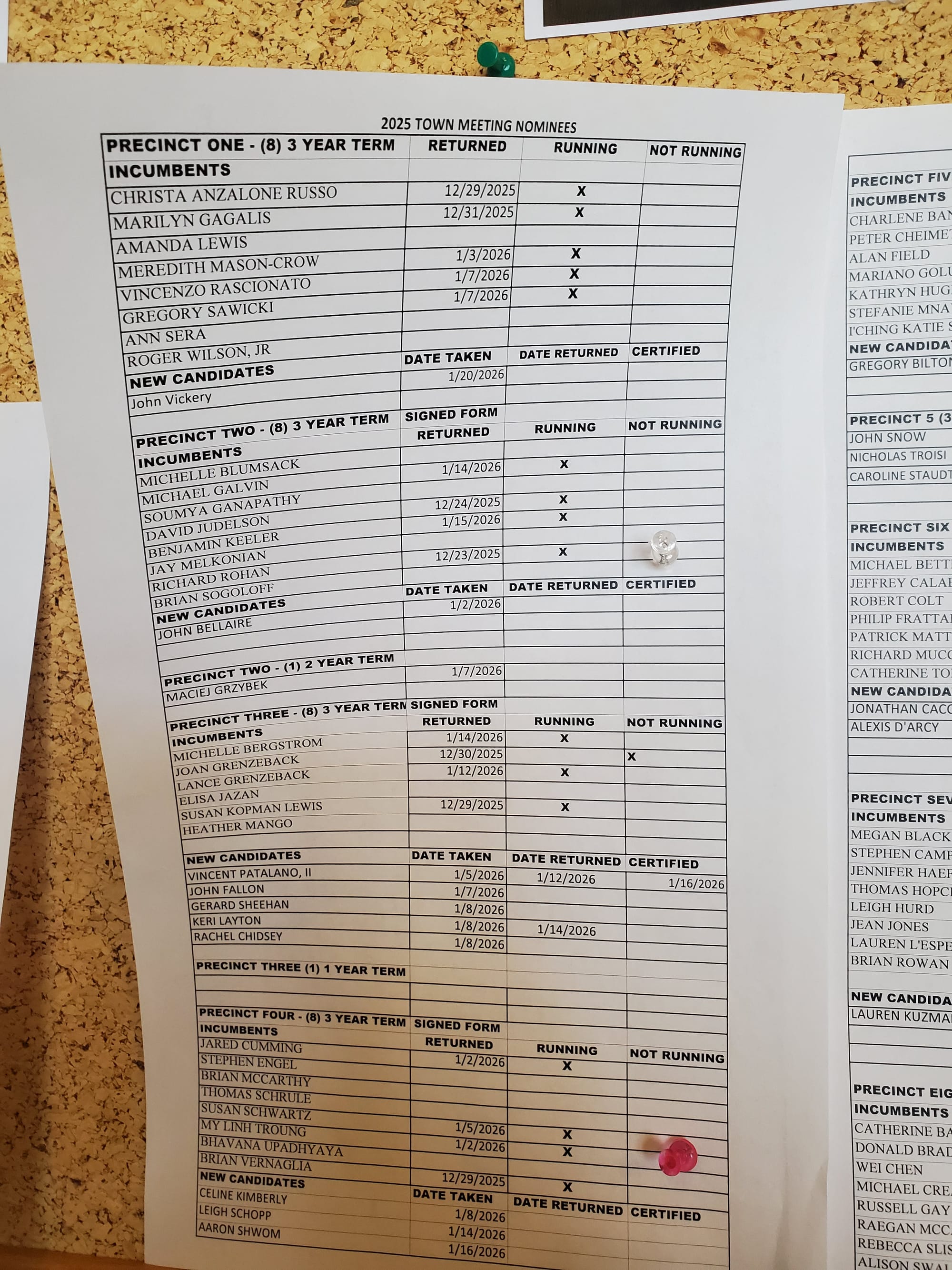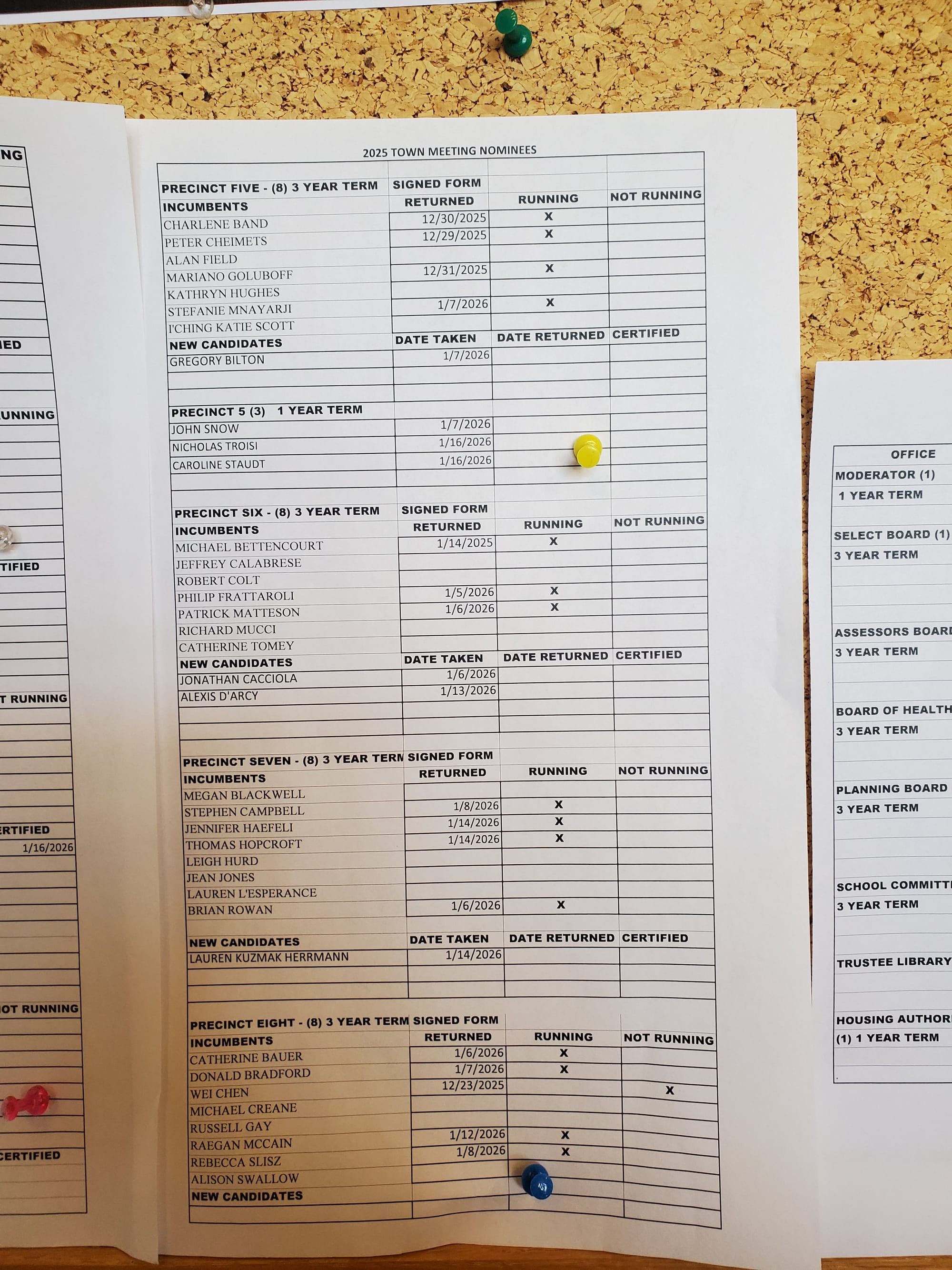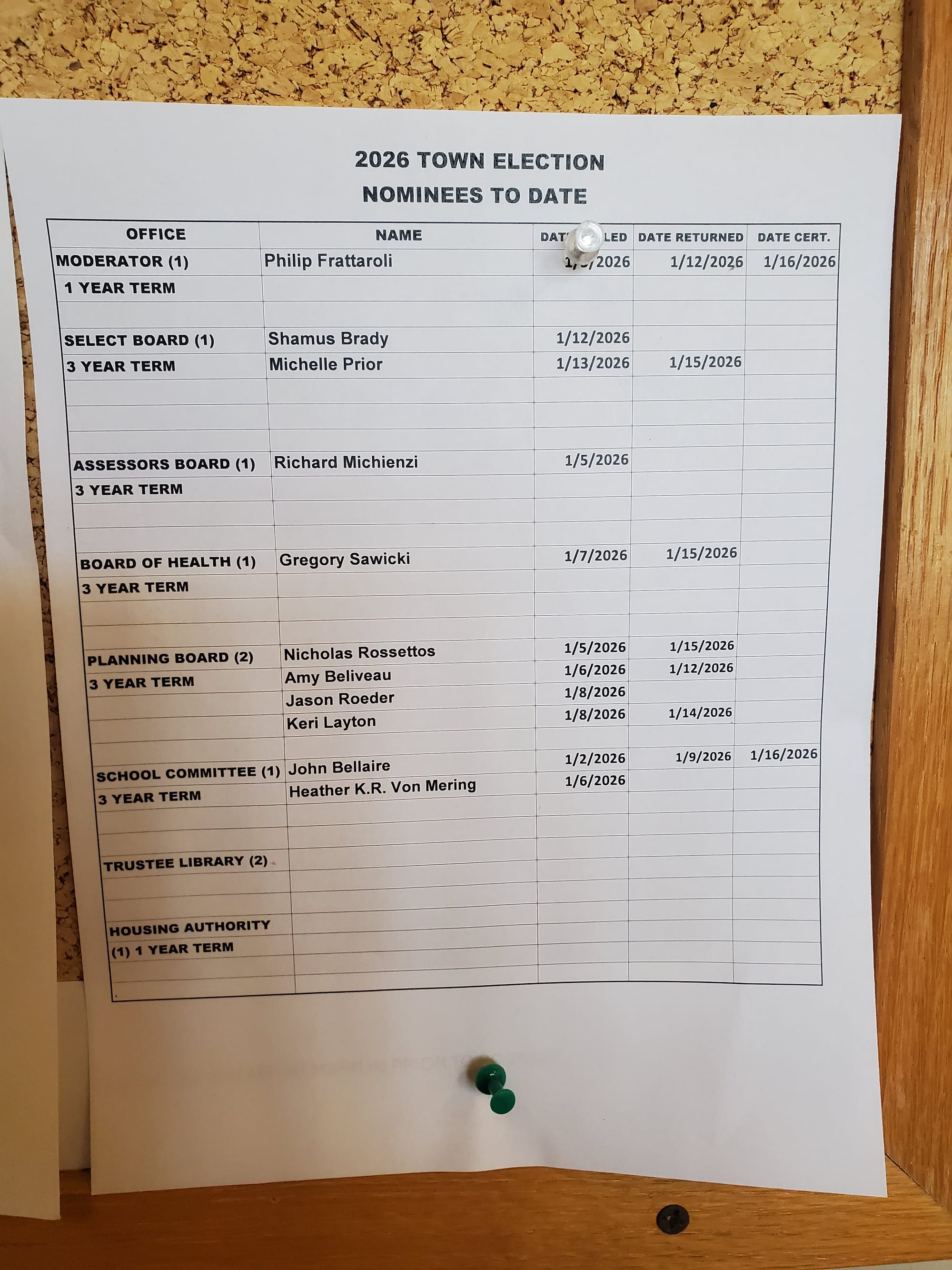 Nomination papers are available from the Town Clerk’s Office at Town Hall, 71 Mount Vernon St., and may be pulled through Jan. 28. Papers must be returned with the required signatures by noon Jan. 30. Some candidates have already returned papers, according to the posting.