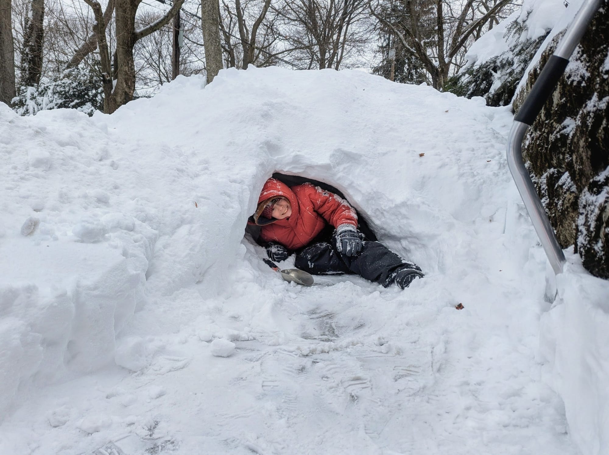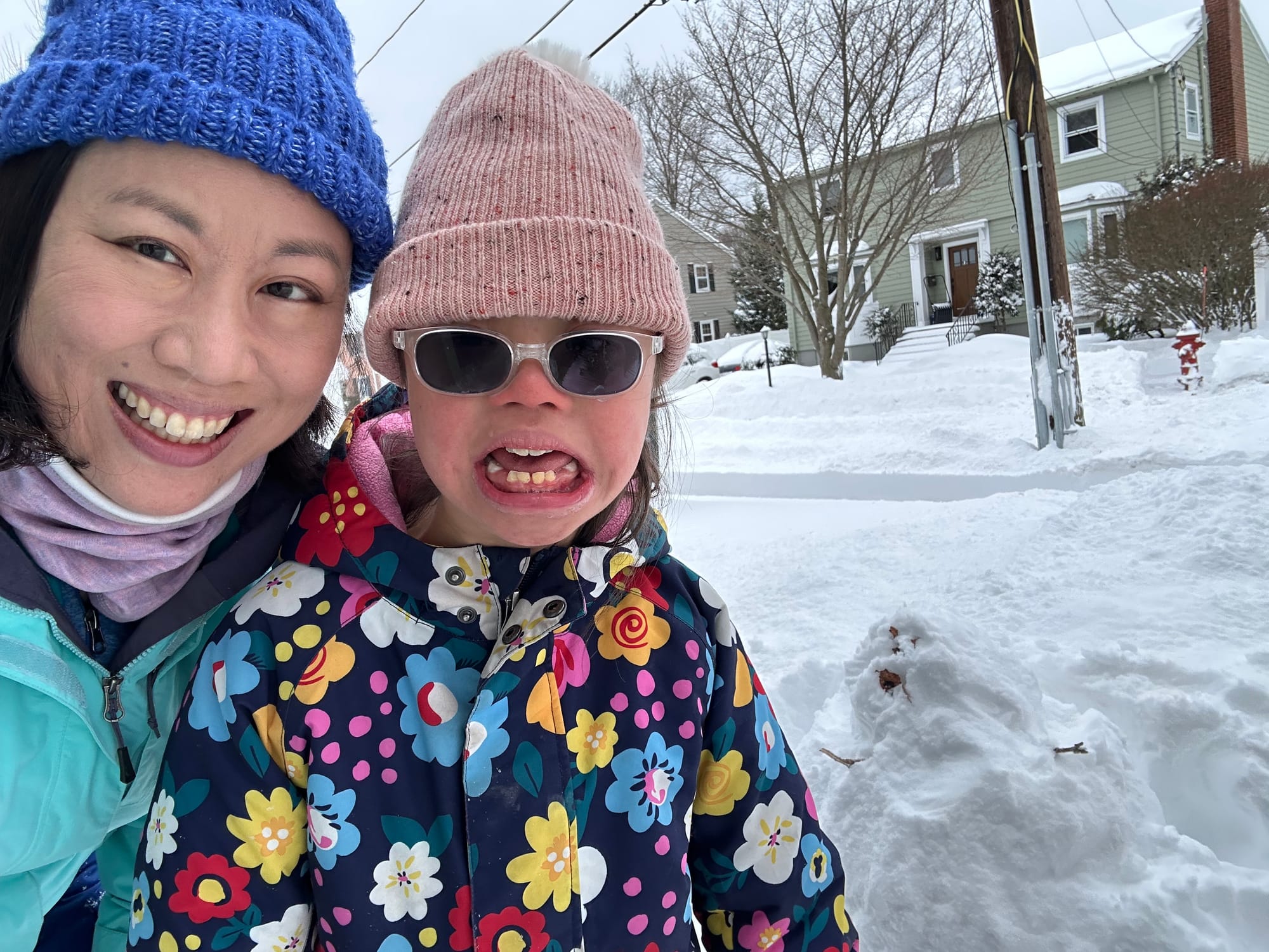 Top, Amy Moy and her daughter Evie on Jan. 26. Amy told us she wanted to offer “a huge shout out to the DPW staff in the bulldozer last night, faithfully plowing our street every few hours. It must have been freezing in the vehicle!” Bottom, In the Symmes corner neighborhood, Heather Ruppel shared these photos of the her kids enjoying their snow day. COURTESY PHOTOS/AMY MOY & HEATHER RUPPEL