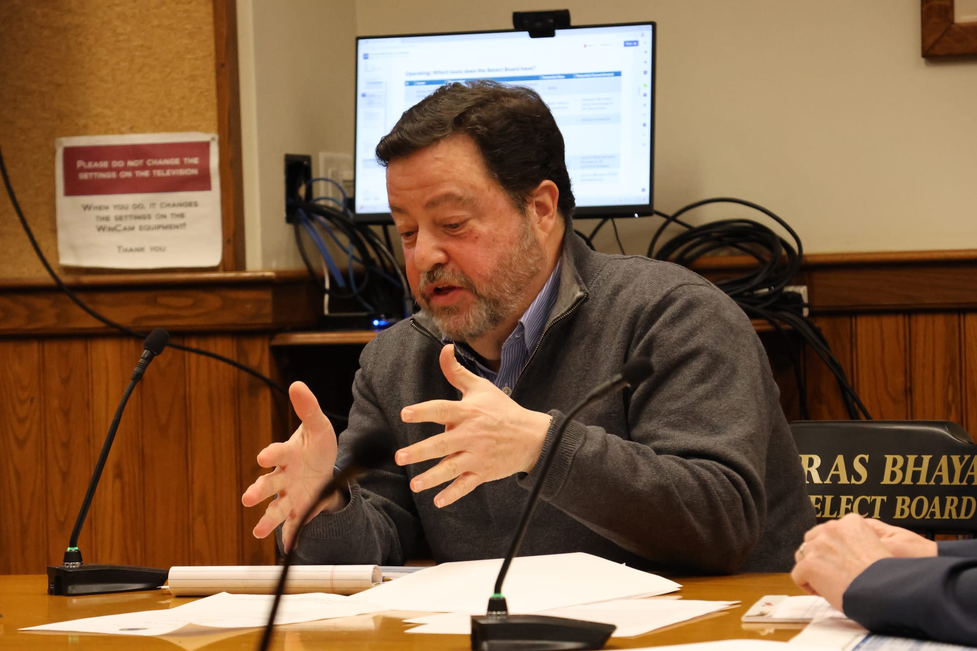 Select Board member Paras Bhayani opened the meeting, walking colleagues through potential cost reductions and revenue increases: $400,000 in reduced school fringe costs by cutting 10 positions from the staffing plan, up to $500,000 in transfer station revenue from commercial rate increases and $250,000 in new growth from housing developments expected in fiscal 2028 or 2029.